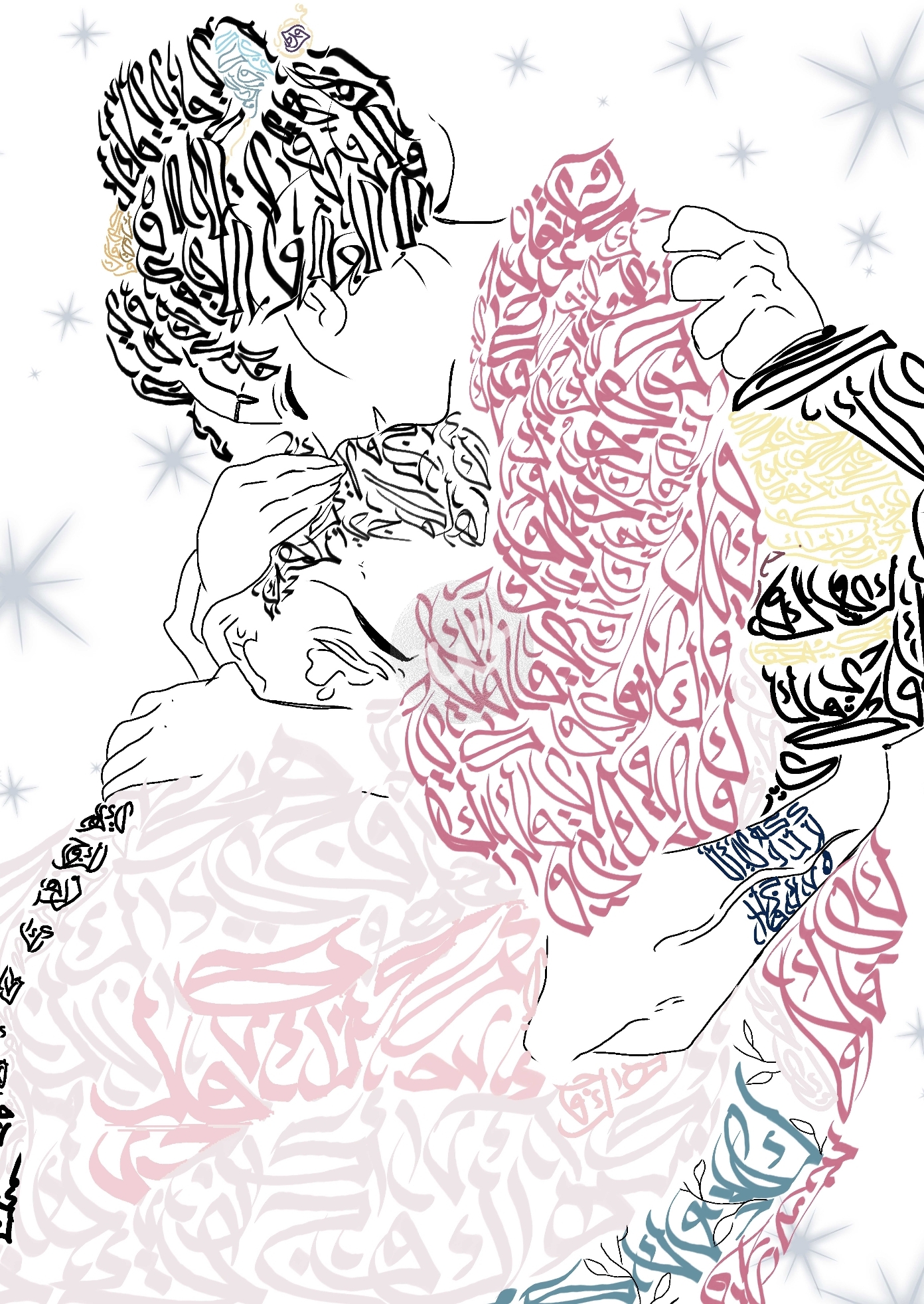 رسمة لأشهر مشهد لأكازا "هاكوجي" وكويوكي من فلم قاتل الشياطين "ديمون سلاير" مرسوم بالخط العربي باستخدام أحرف أسمائهم.