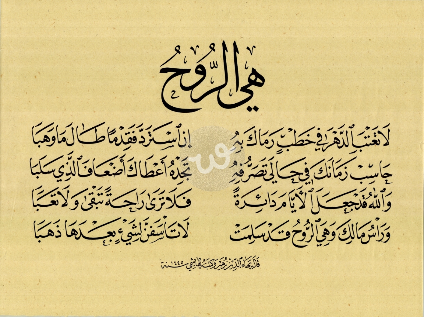 مخطوطة شعرية عربية بخط الثلث لبهاء الدين زهير. من المهم تقبل تقلبات الزمن بحكمة ورضا، باعتبار أن الروح هي أثمن ما نملك، فإذا سلمت فلا يستحق أي فقد آخر أن نحزن عليه