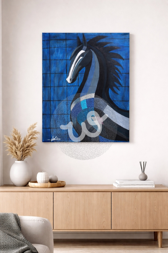 تجسّد قوة الخيل العربية وهي تلتفت بصمتٍ يملأ المكان هيبة. كل ضربة فرشاة فيها تحكي عن الكبرياء، عن القوة الهادئة التي لا تحتاج إلى صوت لتُسمَع.