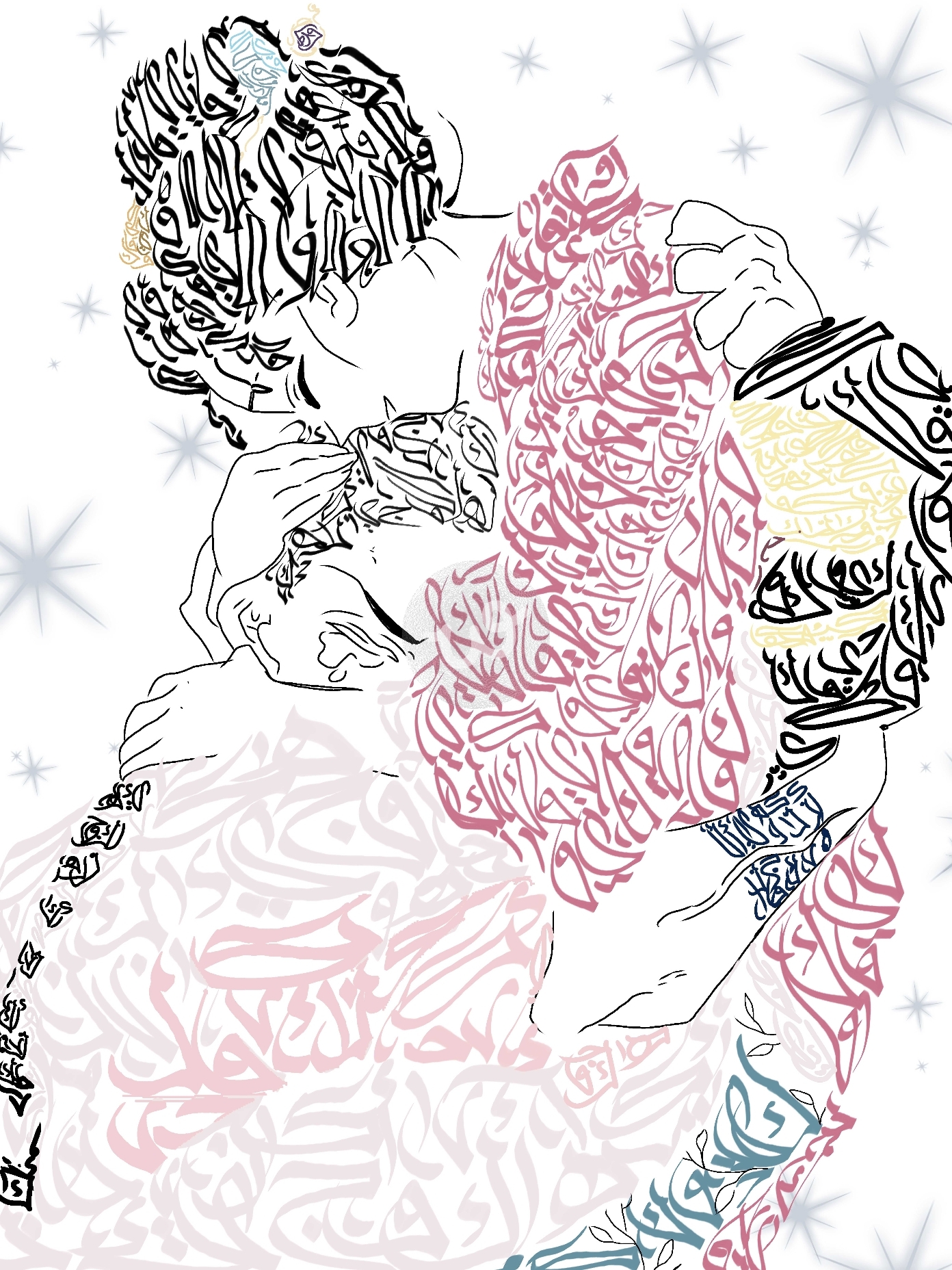 رسمة لأشهر مشهد لأكازا "هاكوجي" وكويوكي من فلم قاتل الشياطين "ديمون سلاير" مرسوم بالخط العربي باستخدام أحرف أسمائهم.