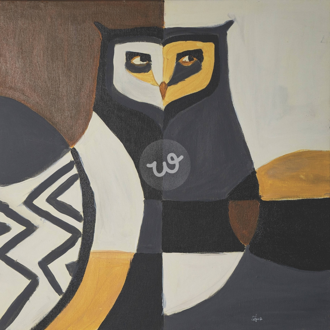 تُظهر اللوحة بومة بتصميم فني مُبتكر بأسلوب تجريدي وجغرافي. تم تصوير البومة بدمج ألوان جريئة مثل الأسود والأبيض مع درجات من الأصفر والبني، مما يعطيها طابعًا مميزًا ومثيرًا للدهشة. يُقسم وجه البومة إلى نصفين متناظرين، أحدهما أبيض والآخر أسود، مع عينين كبيرتين بارزتين تُضفي تعبيرًا عميقًا ومثيرًا على العمل الفني.