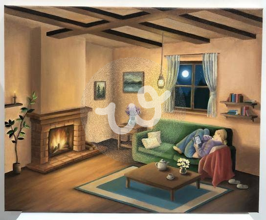 أركز في أعمالي على دمج فلسفة المكان بالمشاعر الإنسانية من خلال الرسم الزيتي، لتحويل الجدران إلى مساحات تنبض بالدفء والحياة وتعكس روح من يسكنها. تبرز اللوحة التضاد الجمالي بين دفء المدفأة وبرودة ضوء القمر مع تفاصيل دقيقة للأثاث الخشبي تضفي عمقاً وتوازناً بصرياً مثالية لإضافة لمسة من الهدوء والجمال لكل مكان. . In my work, I focus on merging the philosophy of place with human emotions through oil painting, transforming walls into spaces that pulsate with warmth and life, reflecting the spirit of those who inhabit them. The painting highlights the aesthetic contrast between the warmth of the fireplace and the coolness of the moonlight, with the intricate details of the wooden furniture adding depth and visual balance, perfect for infusing a space with tranquility and beauty.