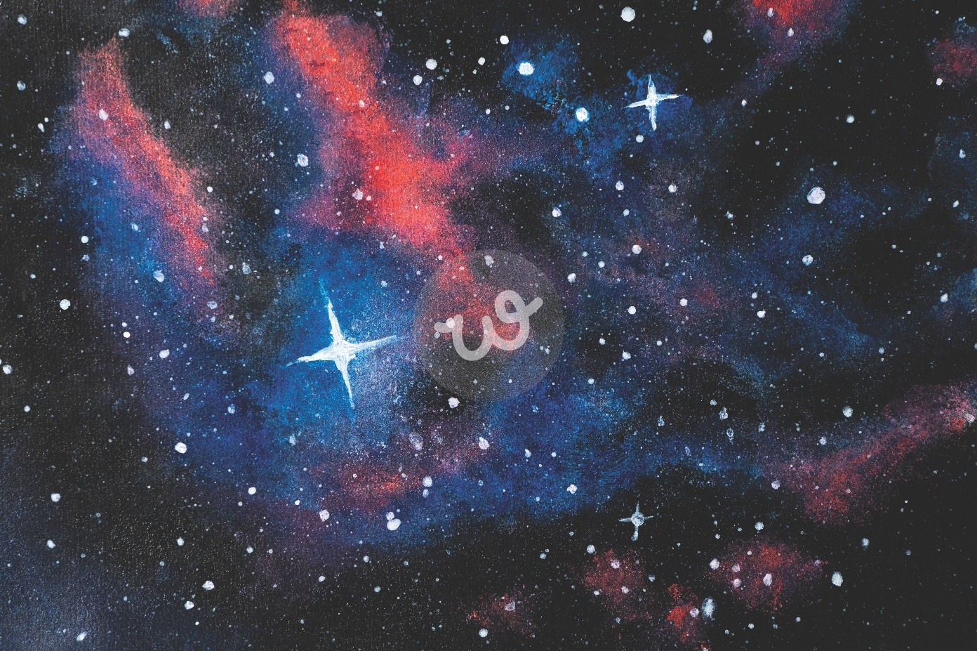 تمتزج ألوان الأزرق والأسود مع لمسات من الأحمر والبنفسجي لتشكل مشهدًا كونيًا ساحرًا. تتناثر النجوم كألماس لامع في ظلمة الفضاء، بينما تتهادى السحب المجرية كضباب غامض يعبر السماء. اللوحة تجسد عمق الكون واتساعه، فتأخذ الناظر في رحلة حالمة بين المجرات البعيدة.