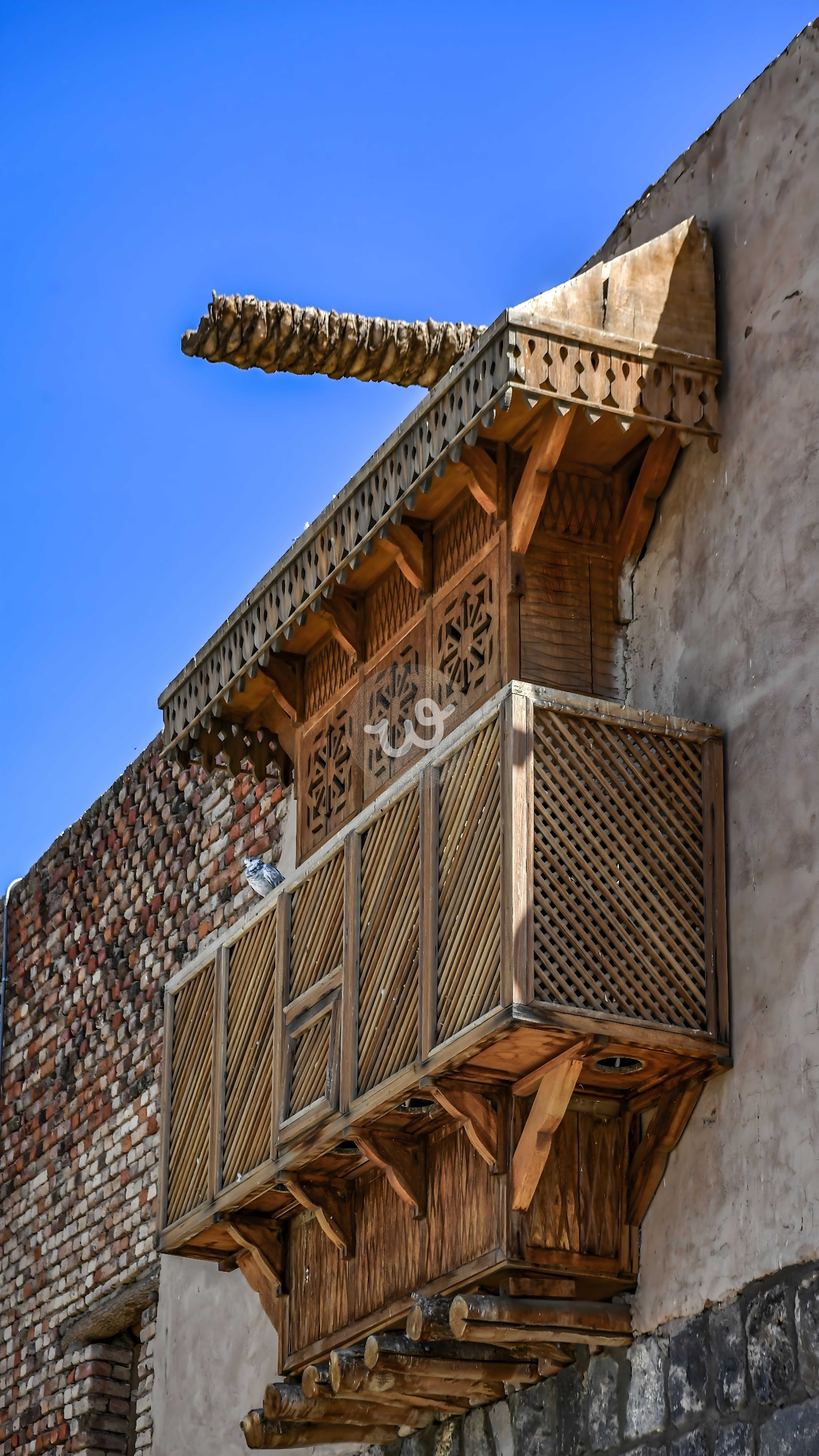 صورة فنية قريبة تبرز تفاصيل "المشربية" أو "الروشان" الخشبي في أحد البيوت التراثية القديمة. يظهر في الصورة التداخل الدقيق للخشب المحفور والزخارف الهندسية التي تعكس براعة الحرفيين القدامى. كما تظهر مادة البناء التقليدية من الحجر والآجر تحت سماء صافية، مما يعطي إحساساً بالأصالة والتاريخ، خاصة في مناطق مثل جدة التاريخية.