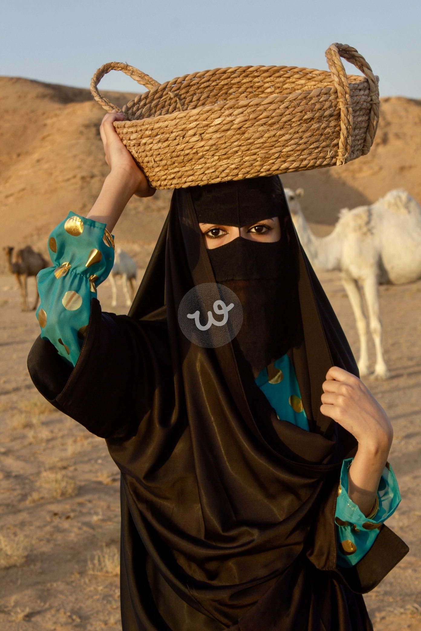 تصوير يجسد جمال المرأة السعودية في بيئتها الصحراوية، وهي تحمل سلة منسوجة بخيوط الطبيعة بينما تقف الإبل خلفها، في مشهد يعكس الأصالة والهوية التراثية. يدمج العمل بين الضوء الذهبي الغربي والألوان الهادئة ليحكي قصة من الجمال والقوة والارتباط بالأرض