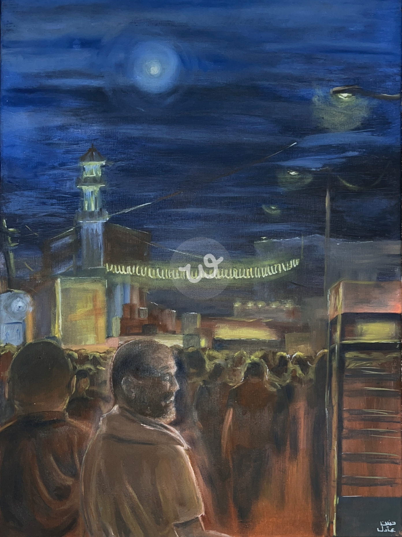 مشهد لسوق مكتض في إحدى الليالي التي كان فيها القمر مكتملًا.