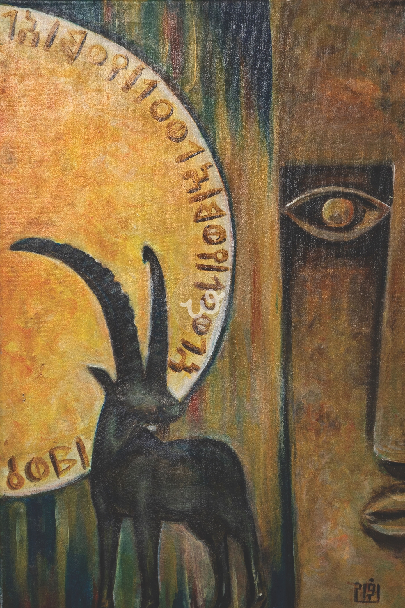 تجسد هذه اللوحة رمزية يوم الوعول اليمني، حيث يتلاقى الموروث الثقافي مع الفن البصري في صورة تعبيرية تجمع بين الطبيعة والتاريخ. يظهر في المقدمة الوعل اليمني البرونزي، رمزًا للقوة والارتباط بالأرض، بينما تتجلى خلفه شمس ذهبية تزينها نقوش قديمة بالخط المسند، تحمل أصوات التاريخ المنقوش على صخور اليمن. إلى يمين المشهد، يتجسد شاهدة جنائزية بملامح غامضة وعين متيقظة، وكأنه شاهد على الزمن وتاريخ الحضارات القديمة التي كرمت الوعول كرمز مقدس.