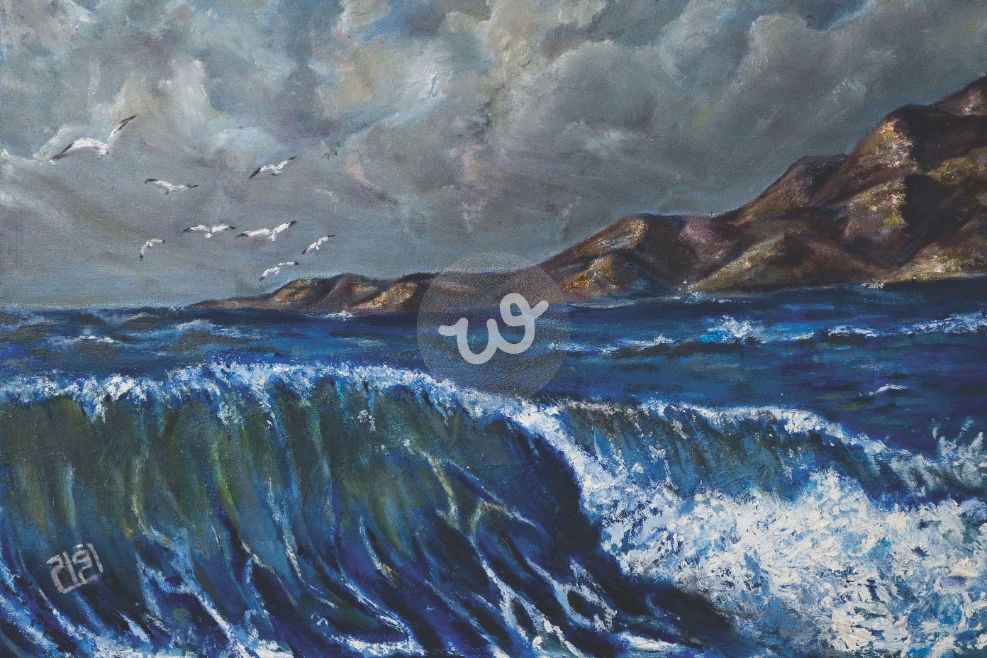 تُظهر اللوحة مشهدًا بحريًا قويًا حيث تهيج الأمواج العاتية تحت سماء ملبدة بالغيوم الداكنة، مما يعكس قوة البحر واضطرابه. في الخلفية، تظهر جبال صخرية وعصافير تحلق فوق الماء، مما يضفي توازنًا بين العاصفة والأمل. الألوان المستخدمة تتدرج بين الأزرق العميق والأبيض الرغوي للموج، مع لمسات رمادية في السماء تعزز الشعور بالدراما والتوتر في المشهد.