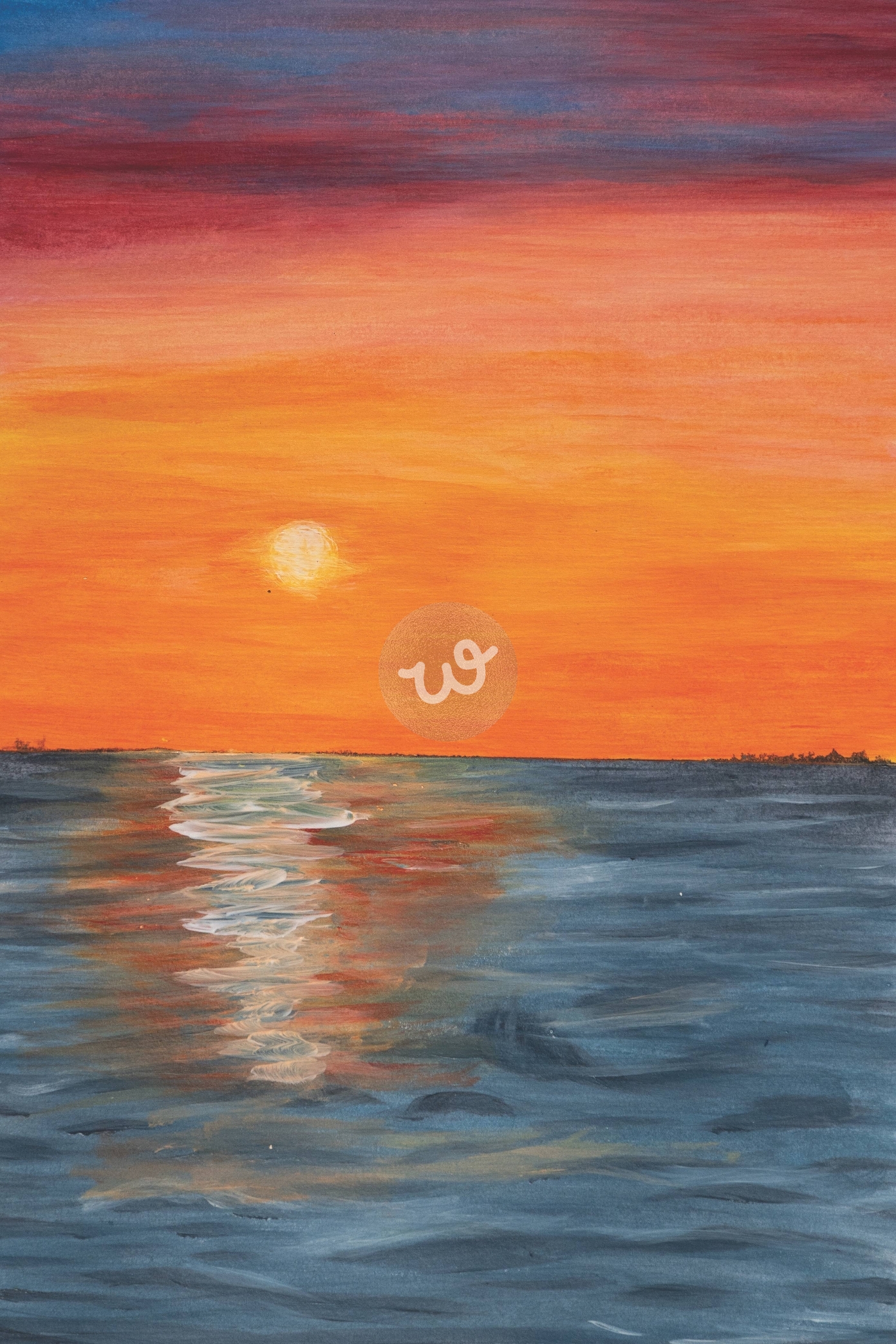تُجسّد اللوحة لحظة غروب هادئة حيث تلتقي الشمس بالبحر، تاركة خلفها انعكاسًا ذهبيًا دافئًا. تمتزج ألوان السماء بين الأحمر، البرتقالي، والأزرق، مما يخلق تدرجًا ساحرًا. الماء يعكس نور الشمس بلطافة، بينما الأفق البعيد يضفي شعورًا بالسلام والتأمل. لوحة تنبض بالمشاعر.