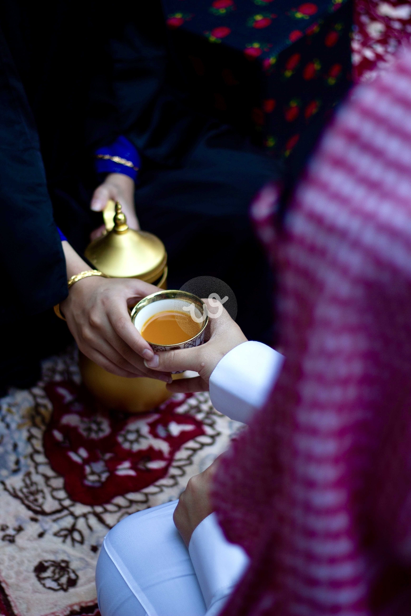 لقطة تعبّر عن أحد أجمل مظاهر الكرم السعودي الأصيل — تقديم القهوة العربية. تُظهر الصورة لحظة التقاء الأيدي بين من يقدّم الفنجان ومن يتلقاه، في مشهد يجسد روح الاحترام والضيافة المتجذّرة في ثقافة المجتمع السعودي. الألوان الدافئة وتفاصيل الذهب والنقوش تضيف إحساسًا بالفخامة والتراث