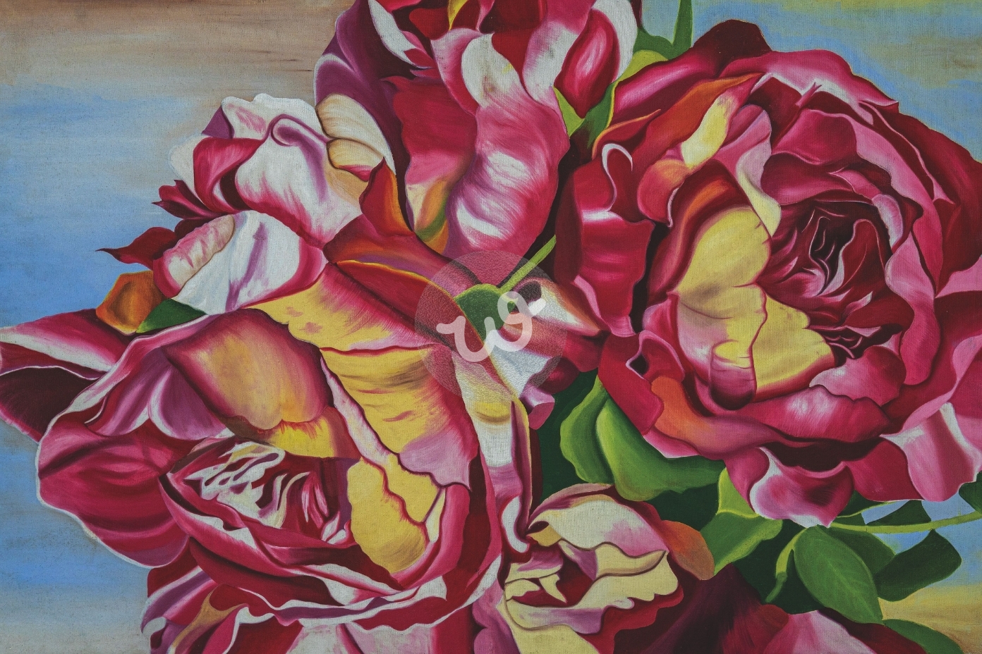 لوحة فنية بالألوان الزيتية فيها تفاصيل لمجموعة من الورود