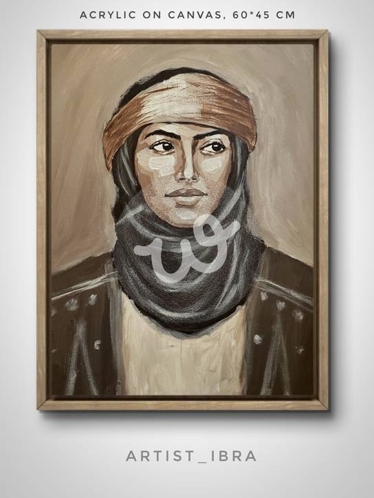 تعبر عن بورتريه لامرأه بزي سعودي انيق بتفاصيل ماامح مميزه اسلوب تاثيري بدرجات البني