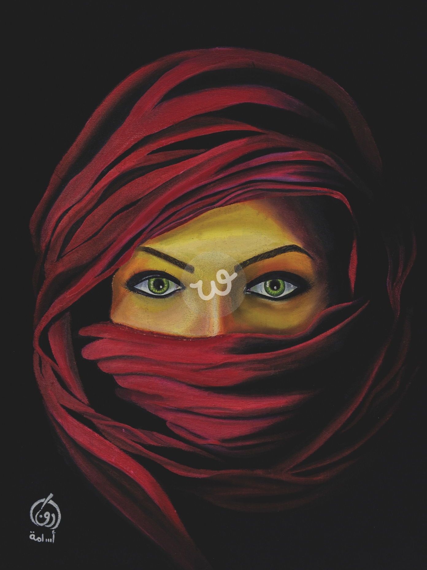 لوحة فنية مرسومة على خلفية سوداء تظهر فيها امرأة ملثمة