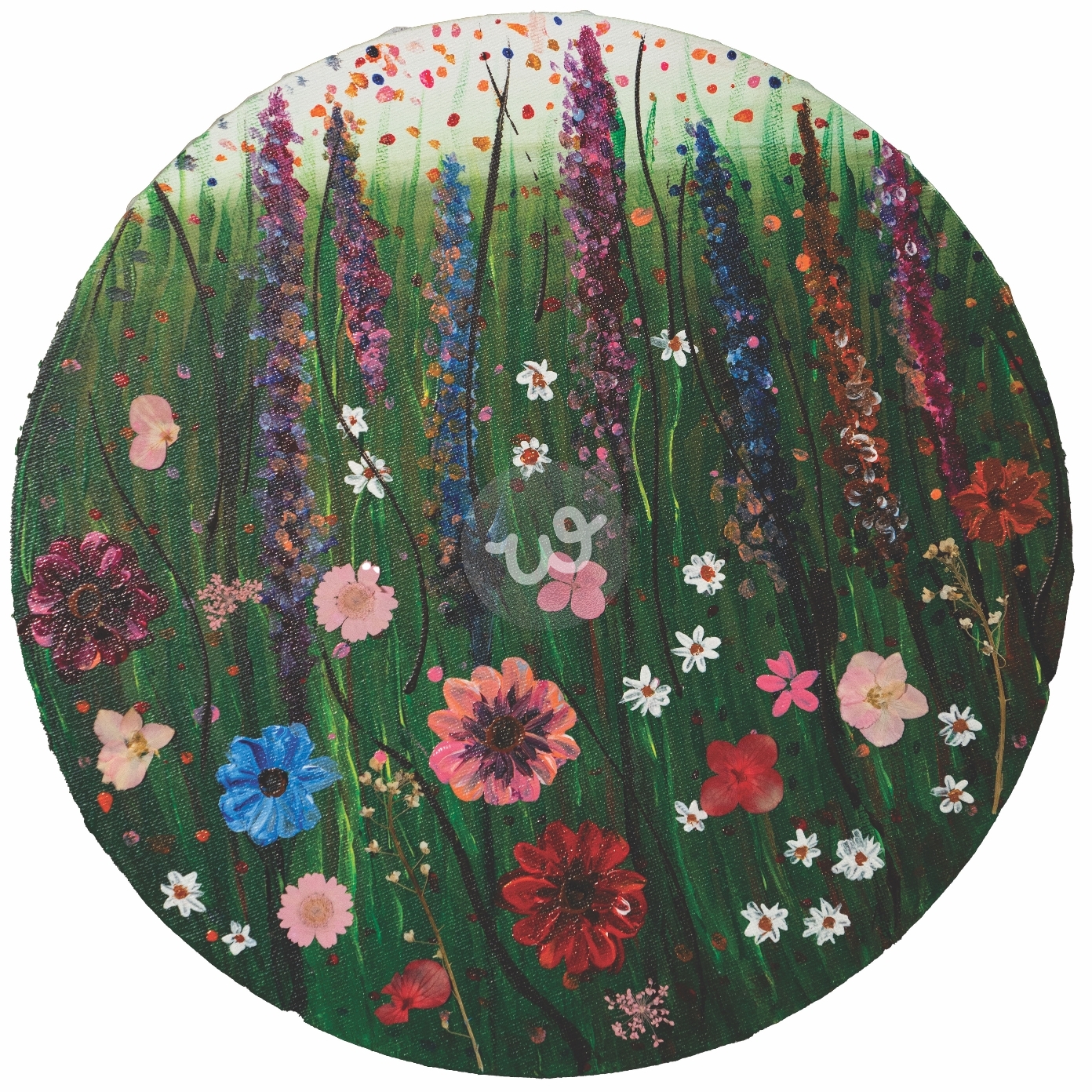 اللوحة تُظهر حديقة غنية بالألوان، مصممة بشكل دائري. تتنوع الأزهار في الألوان والأشكال، حيث توجد أزهار زرقاء، حمراء، وردية، وبيضاء، مما يخلق تبايناً جميلاً. الخلفية خضراء، تمثل العشب، مع لمسات من الألوان الزاهية التي تعكس حيوية الطبيعة. إضافةً إلى ذلك، تظهر بعض اللمعان والأنماط الفنية التي تعزز من تأثير اللوحة وتضيف لها عمقاً. تعكس اللوحة شعوراً بالبهجة والانتعاش.