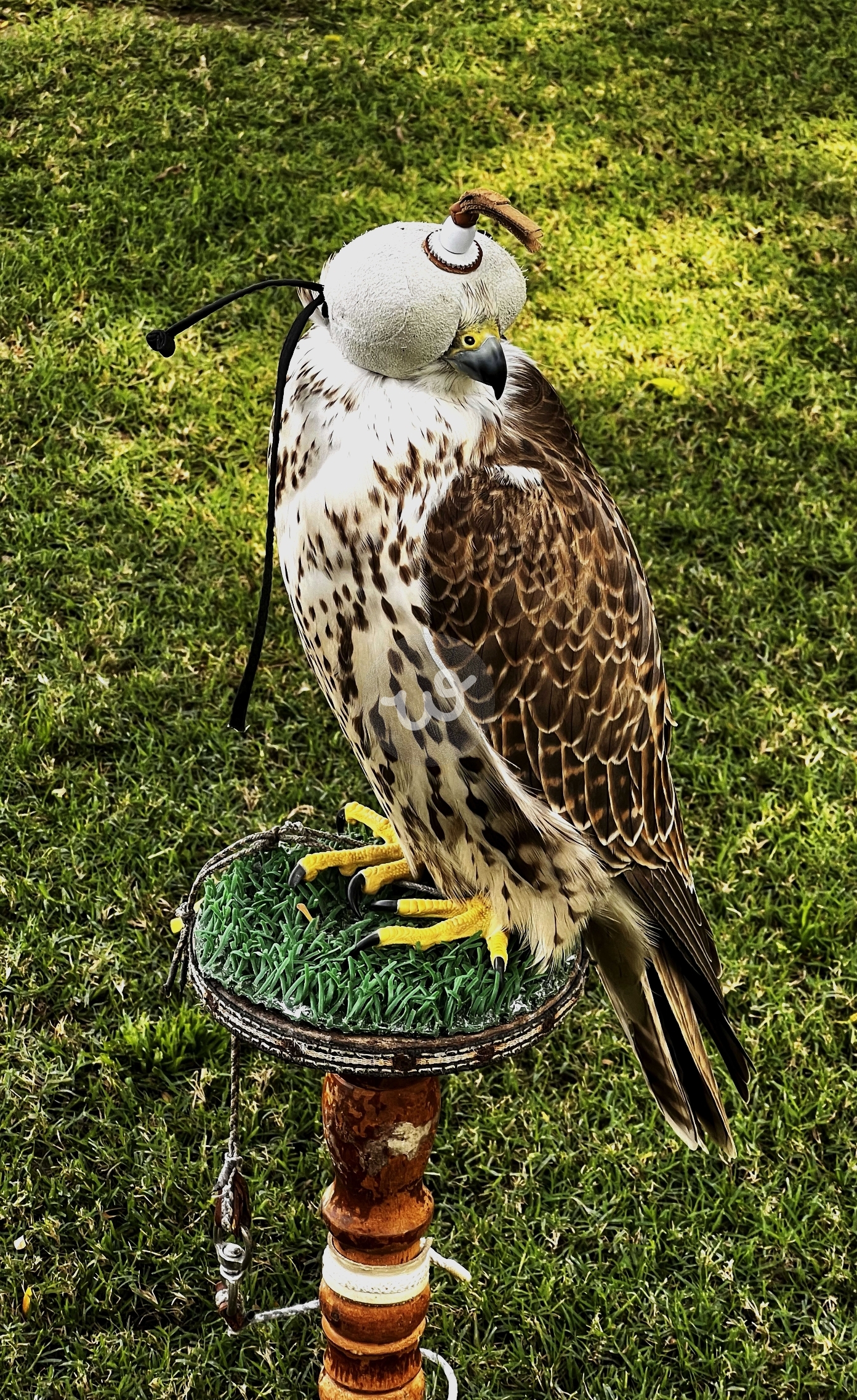 عمل رقمي يصوّر لحظة وقوف الصقر العربي على قاعدة خشبية مزخرفة وسط الطبيعة الخضراء