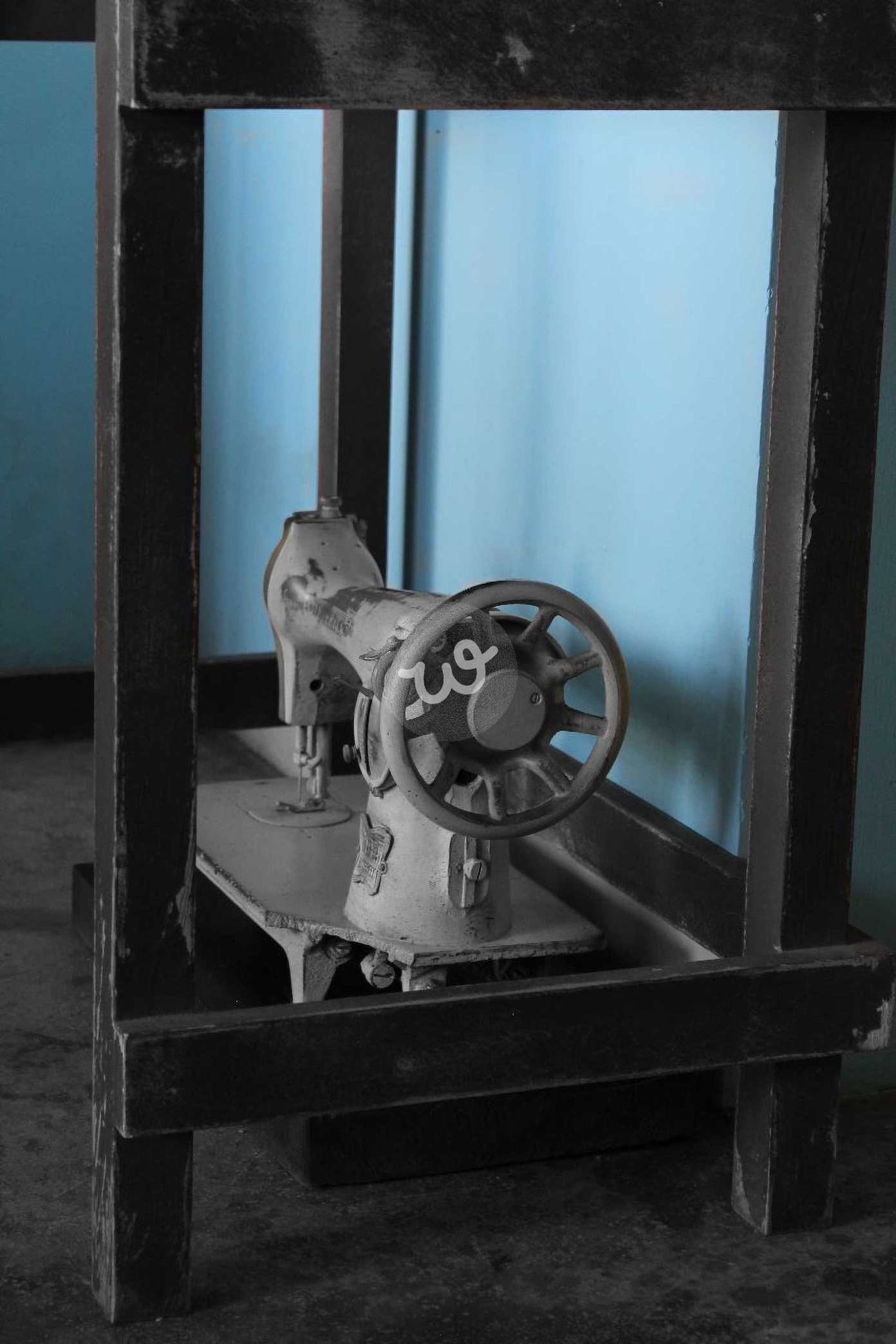 تصوير فوتوغرافي لطابعة خياطة معدنية قديمة بتقنية الطبيعة الصامتة يبرز خامة الحديد وتفاصيل الزمن عليها