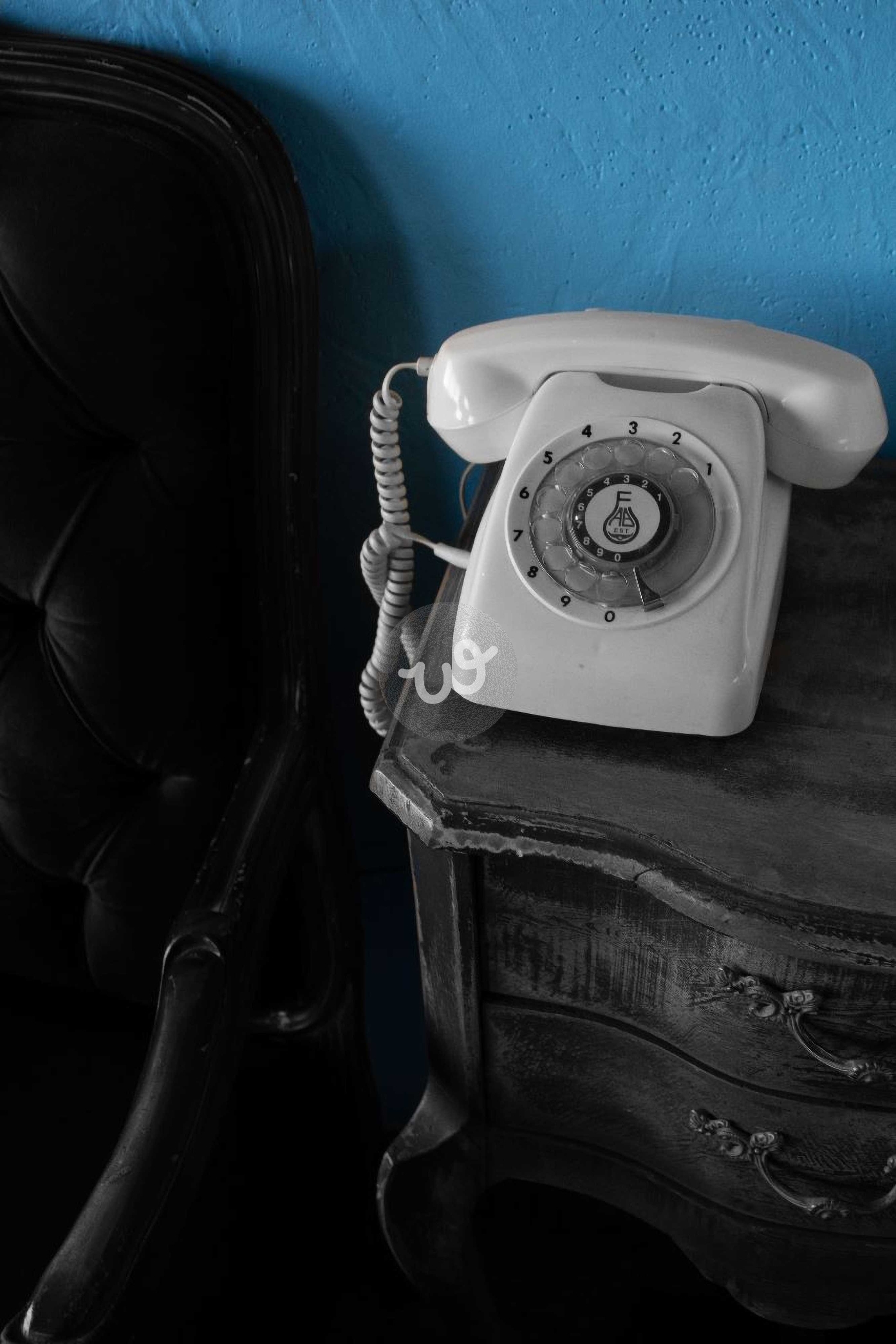 تصوير فوتوغرافي لهاتف قديم على طاولة خشبية يبرز خامة الخشب بتقنية الطبيعة الصامتة.