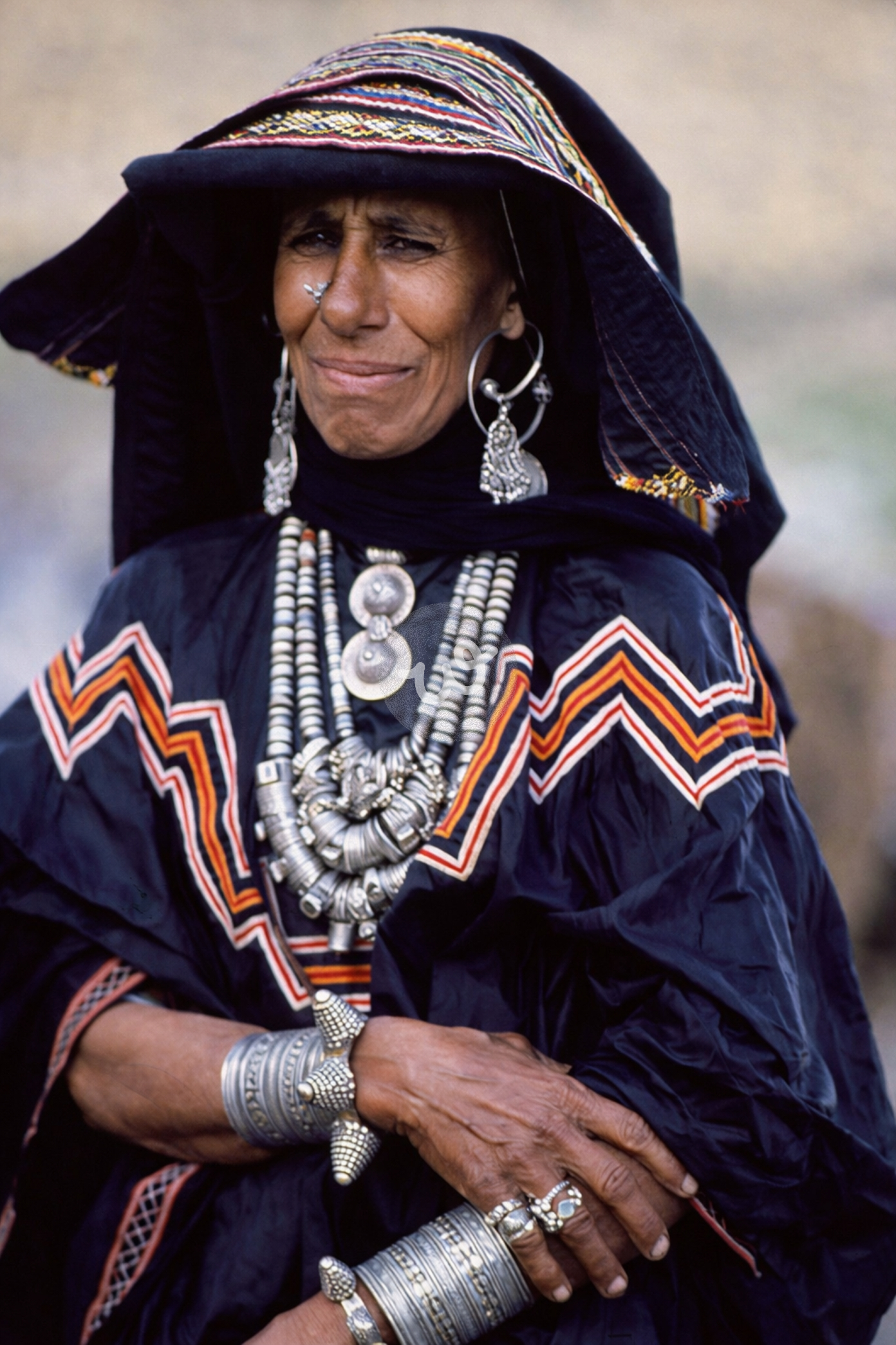 صورة تراثية لامرأة من منطقة عسير في جنوب غرب المملكة العربية السعودية ترتدي الزي التقليدي الداكن والمزين بالتطريزات الملونة . والحلي الفضية الثقيلة والمتعددة الطبقات التي تزين منطقة الصدر، بالإضافة إلى الأساور والخواتم الفضية ذات النقوش التقليدية