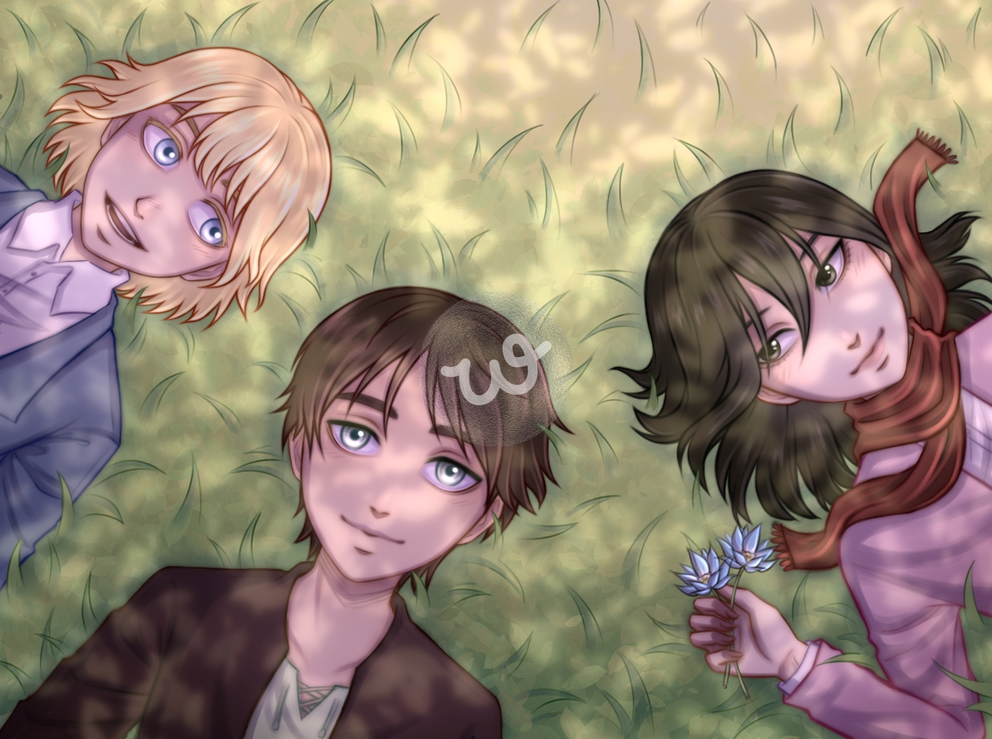 رسمة ل ٣ اصدقاء من الانمي الشهير هجوم العمالقة ، يستلقون تحت الشجرة ويتأملون السماء