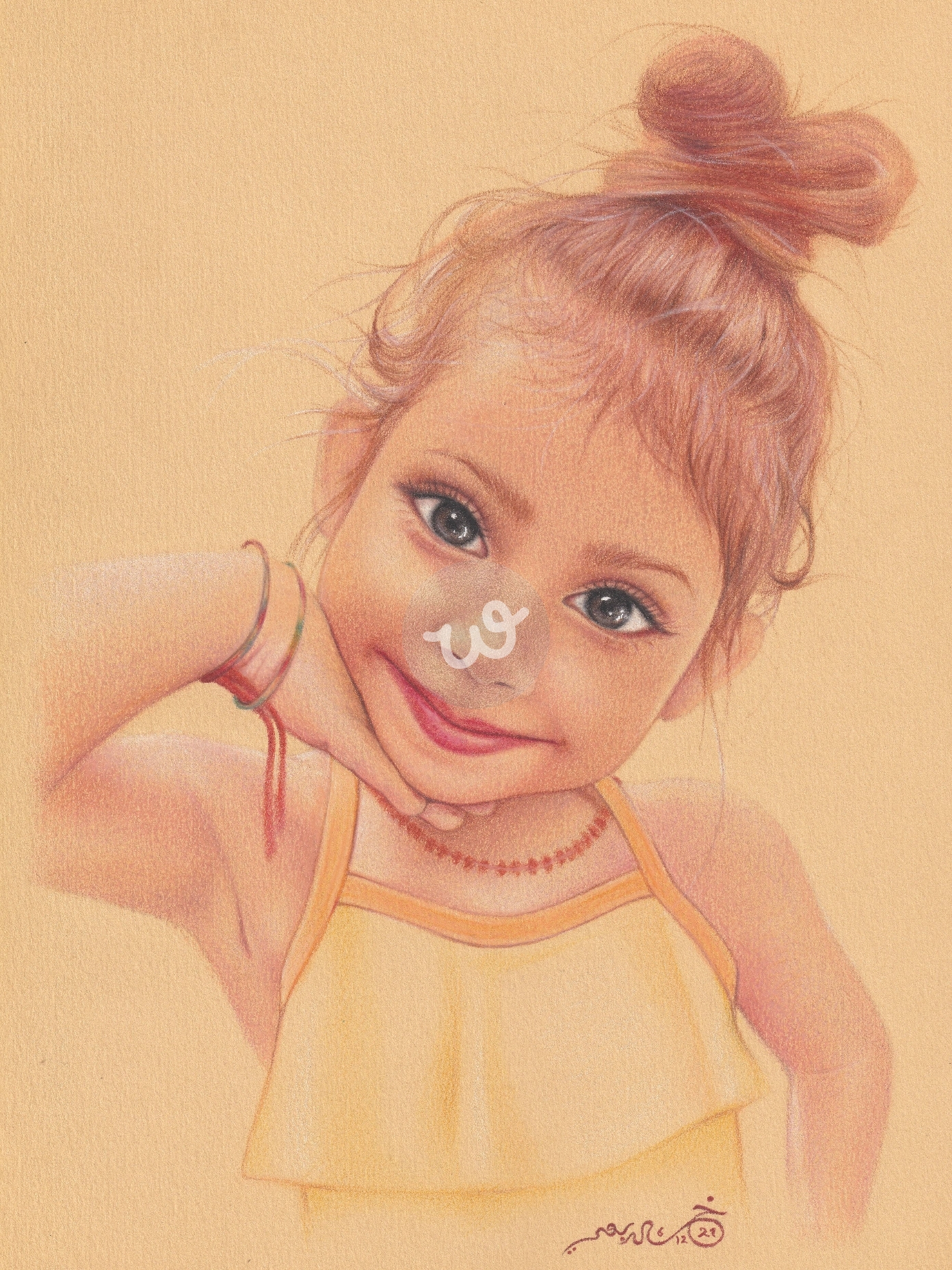 هذه اللوحة الفنية الرائعة تُجسّد بورتريه لطفلة صغيرة بملامح بريئة وتعبير دافئ، حيث تبتسم ابتسامة مشرقة تفيض بالبراءة والعفوية. التفاصيل الدقيقة في الرسم تظهر براعة الفنان في استخدام الألوان والظلال لإضفاء لمسة حيوية على البشرة، مع إبراز ملامح الطفلة بدقة متناهية، خاصة في العيون الواسعة اللامعة التي تعكس الإحساس بالدهشة والفرح. الشعر المرفوع بعفوية بأسلوب الكعكة الفوضوية يضيف واقعية إلى اللوحة، مع تداخل خصلاته بلون بني دافئ ينسجم مع الخلفية الكريمية الهادئة.