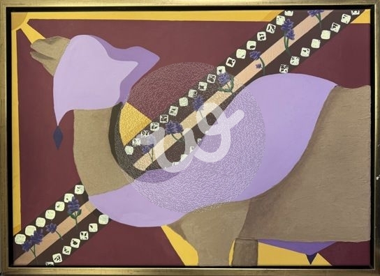 رسمه عن عام الابل يظهر فيها جمل مغطى بوشاح بنفسجي مثل لون الخزامى ومن خلف الجمل يوجد السدو مما يعزز الهويه السعوديه مع الرمل في جسد الجمل ترمز الى الصحاري التي في السعوديه .