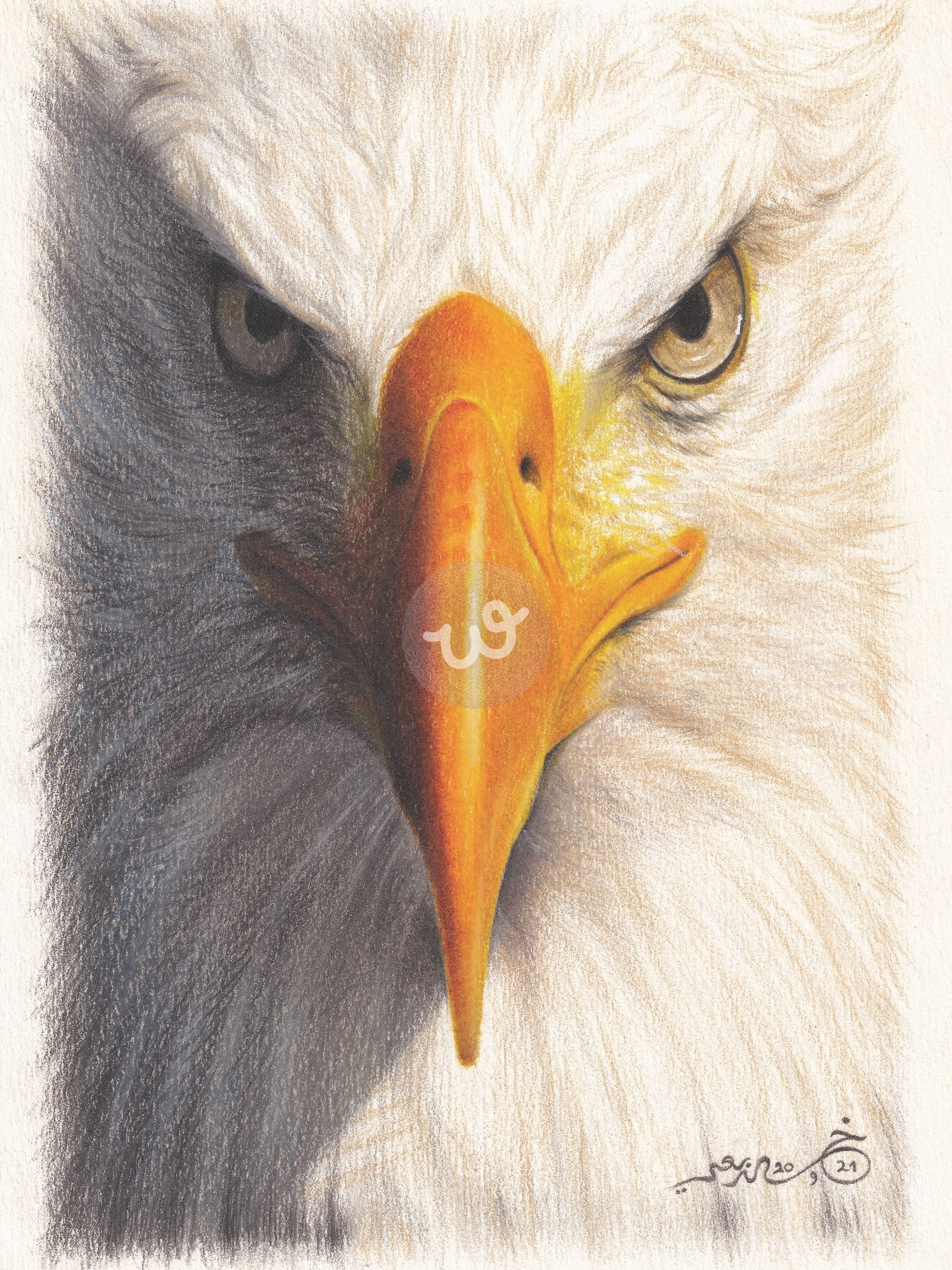 هذه اللوحة تُبرز بورتريه واقعيًا لنسر، يُجسّد القوة والحدة في النظرات. العينان الثاقبتان مرسومتان بدقة متناهية، مما ينقل إحساسًا بالتركيز والعزيمة. المنقار القوي بلونه البرتقالي المُشبع يضيف تباينًا جذابًا مع الريش الأبيض الناعم، حيث استخدم الفنان تدرجات الألوان والظلال لإبراز تفاصيل النسيج والعمق. الألوان المتناغمة والاهتمام بالتفاصيل تجعل اللوحة تنبض بالحياة، وكأن النسر يحدق مباشرة بالمشاهد، ما يعكس رمزية الهيبة والحرية. هذه اللوحة ليست مجرد رسم، بل تعبير عن روح النسر الجسورة،