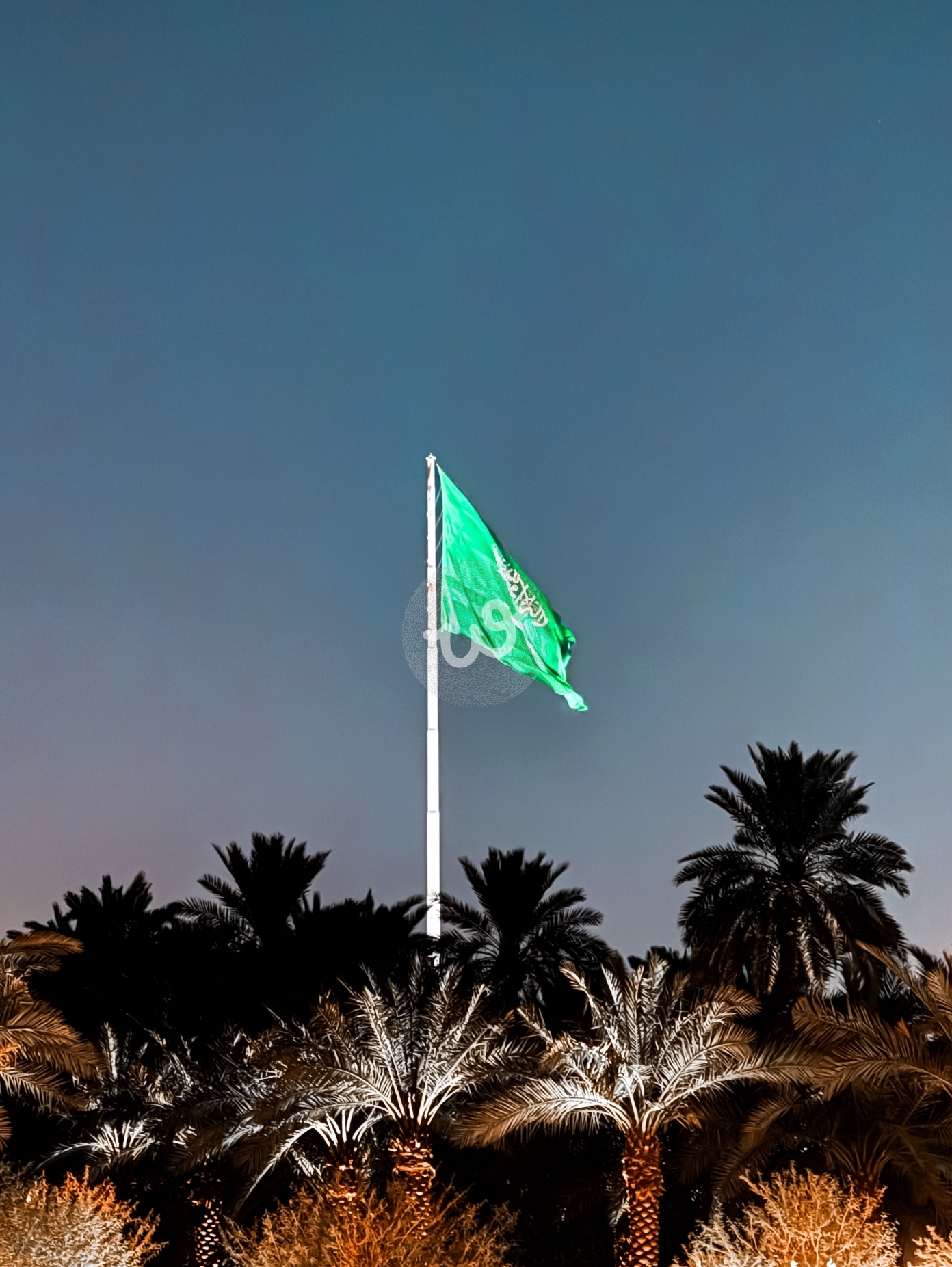 علم المملكة العربية السعودية يرفرف شامخاً في السماء وحوله أشجار النخيل