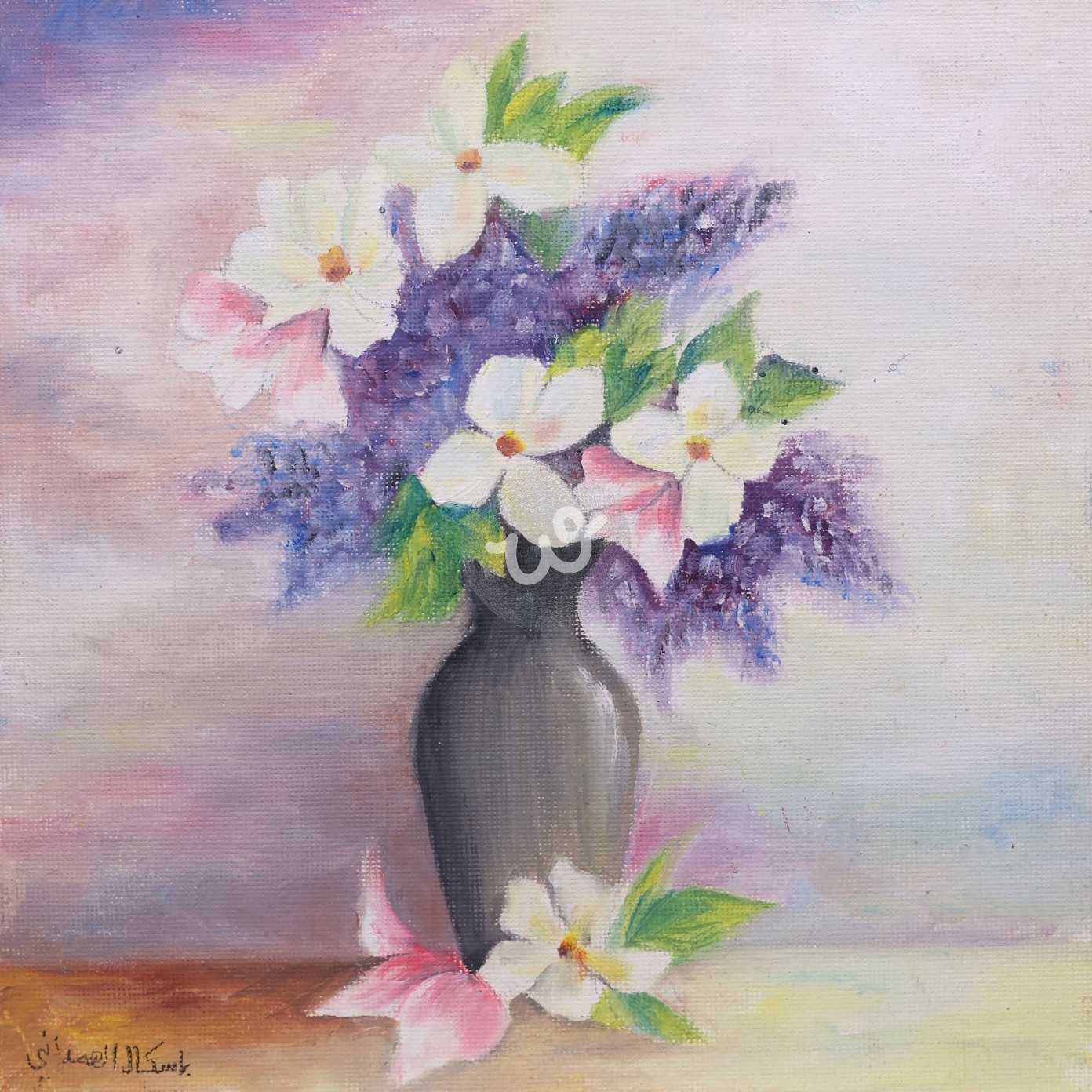 تتوسط اللوحة مزهرية أنيقة تحتضن باقة من الورود البنفسجية، التي تنبض بالحياة كأنها تروي قصص الحب والأمل. تنساب الألوان بعمق، حيث يعكس البنفسجي الغموض والسحر، بينما تضفي الأوراق الخضراء المحيطة لمسة من الانتعاش. تملأ هذه الزهور الفضاء بعطرها، وتخلق شعورًا بالراحة والسكينة، مما يجعل المشاهد ينسى همومه لحظة.