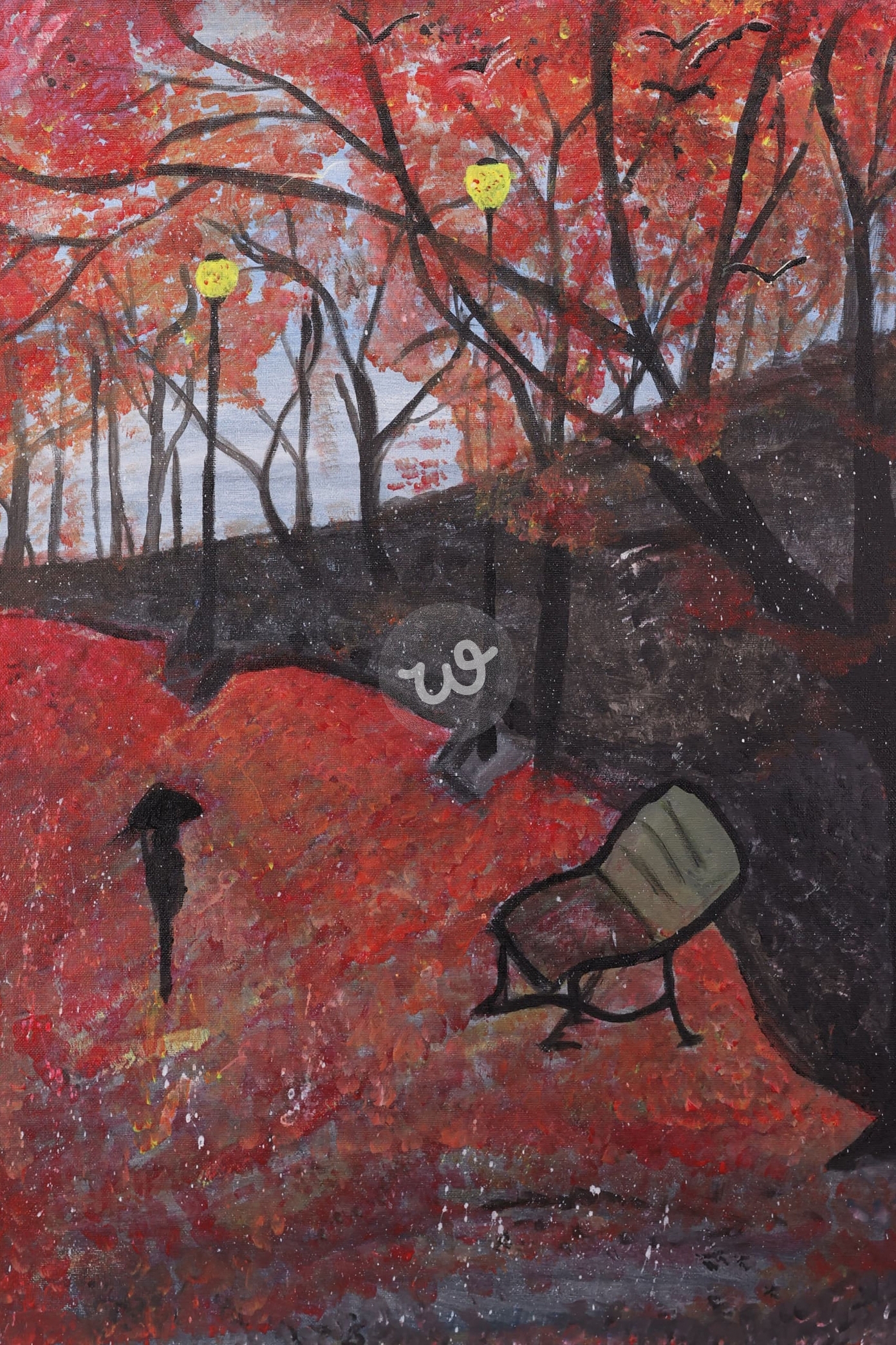تأخذنا هذه اللوحة في رحلة عبر ممر خريفي هادئ، حيث تتساقط الأوراق وكأنها تهمس بأسرار الماضي. الأشجار الداكنة تحتضن الطريق بمزيج من الألوان الدافئة، بينما تضيء المصابيح بصمت، وكأنها تراقب العابرين بصبر. الكرسي الفارغ المستند إلى جذع الشجرة يروي قصة انتظار لم يكتمل أو راحة لشخص ترك المكان ومضى. في الخلفية، يسير ظل شخص وحيدًا، متجهًا نحو المجهول، وكأن الطريق يقوده إلى نسيان ما كان أو مواجهة الذكريات التي تأبى الزوال.