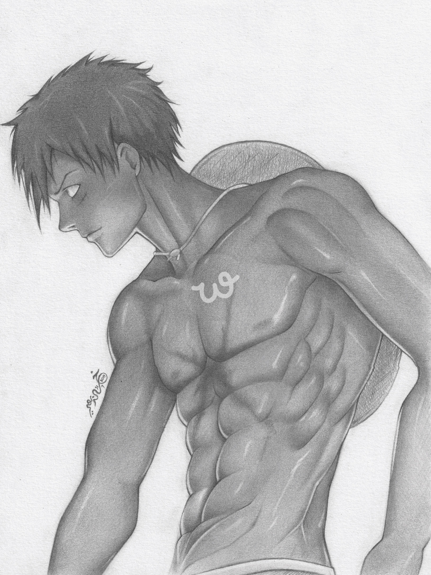 هذه اللوحة، يظهر مونكي دي لوفي بأسلوب فني مميز بالأبيض والأسود، حيث يبرز مظهره القوي والرياضي. تعكس تفاصيل الرسم ملامح شخصيته الجريئة، مع عضلات بارزة توضح مدى قوته ولياقته البدنية، بينما يتدلى قبعته القشية الشهيرة على ظهره، في إشارة إلى رمزيته كقبطان قراصنة قبعة القش. تبدو ملامح وجهه هادئة لكن تحمل في طياتها التصميم والعزيمة، وكأنها لحظة تأمل قبل معركة أو بعد إنجاز عظيم. استخدام التظليل بطريقة دقيقة يضفي عمقًا وواقعية على الرسم، مما يجعل المشهد ينبض بالحياة رغم كونه بألوان رمادية فقط.