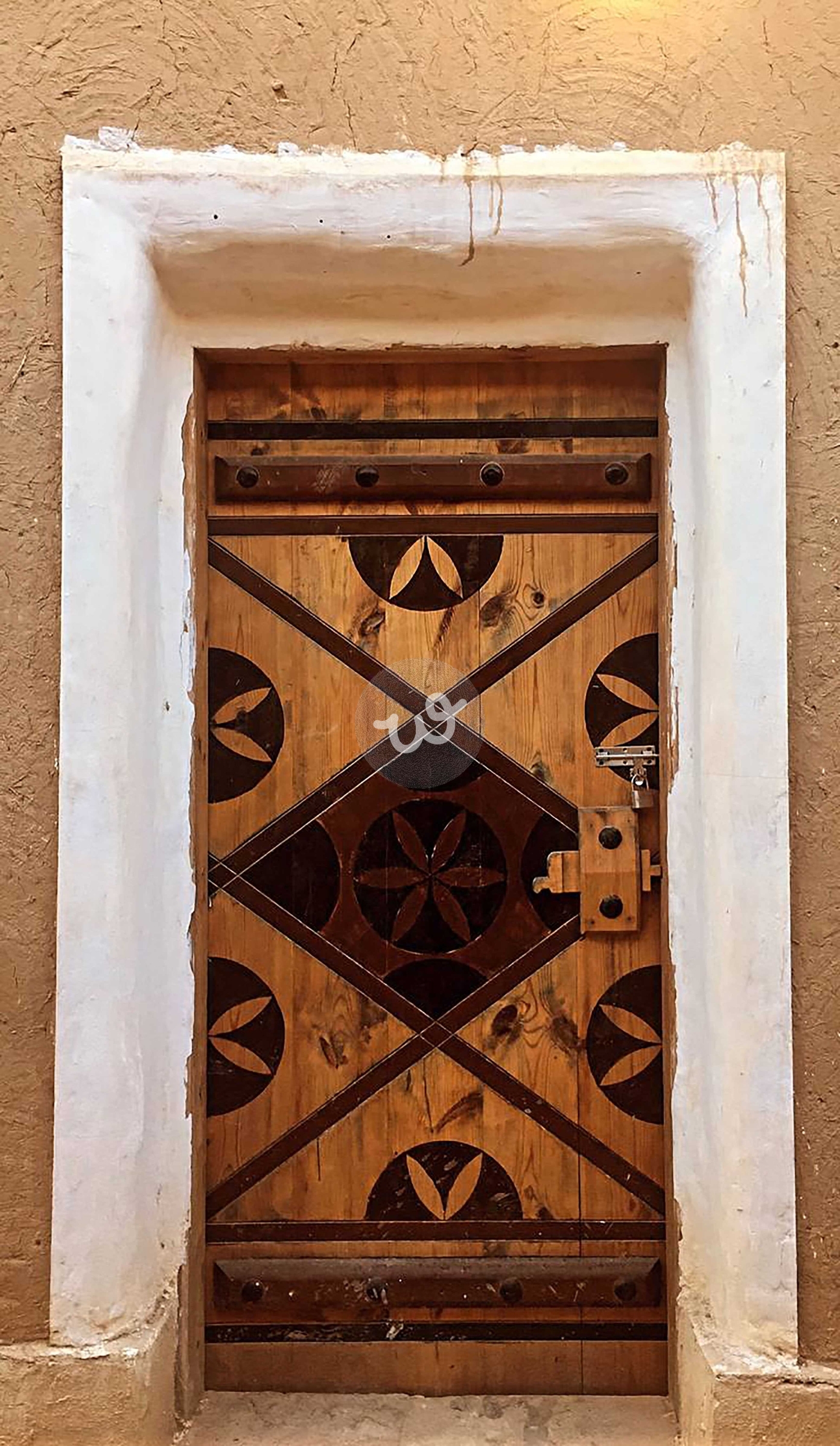 باب تراثي خشبي يعلوه إطار من الجص الأبيض داخل جدار طيني، تزينه نقوش هندسية داكنة تعكس أصالة الحرفة ودفء البيوت القديمة.