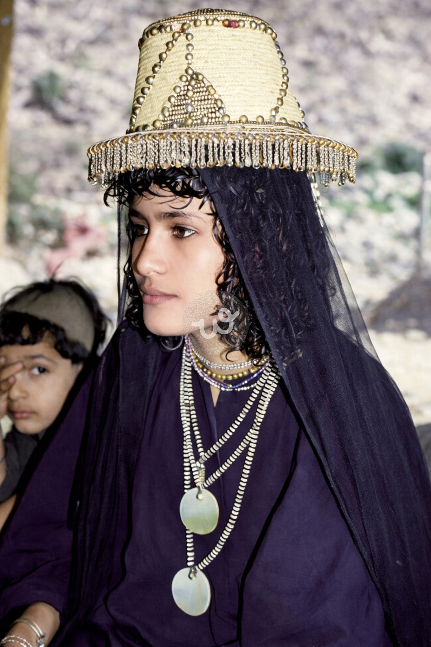 صورة لامرأة في غاية الجمال من منطقة عسير في جنوب غرب المملكة العربية السعودية قبل أكثر من ثلاثة عقود وهي ترتدي الزي التقليدي وتتزين بالحلي الفضية الثقيلة والمتعددة الطبقات التي تزين منطقة الصدر.