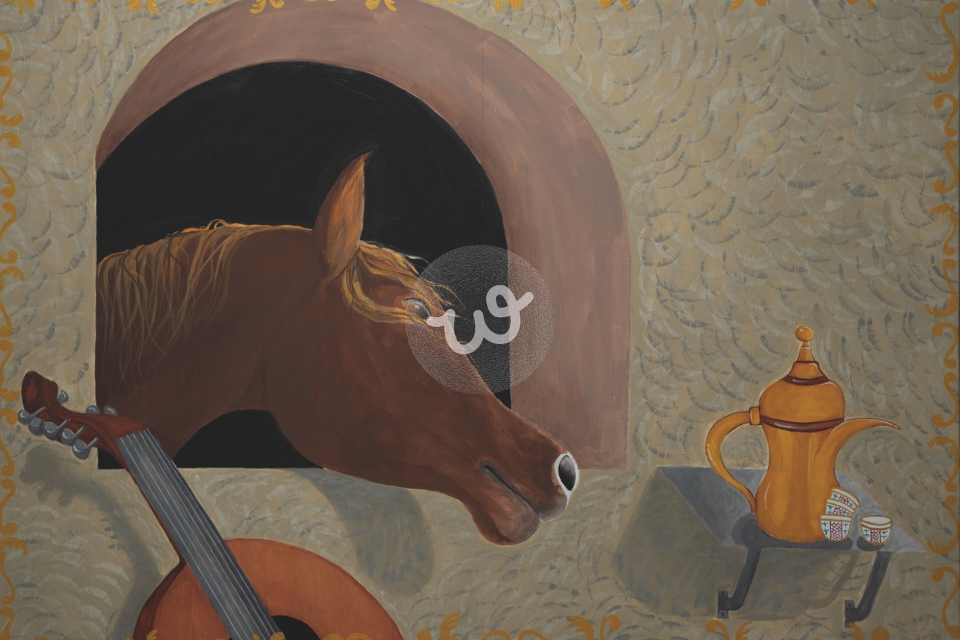 تجمع هذه اللوحة بين ثلاثة رموز تجسد روح التراث العربي الأصيل: الحصان، العود، والقهوة. الحصان، الذي طالما كان رمزًا للأصالة والفخر لدى العرب، يطل برأسه من نافذة مقوسة، متأملًا المشهد أمامه وكأنه جزء لا يتجزأ من الحياة اليومية. على الجانب الآخر، تجلس دلة القهوة الذهبيّة بجانب فناجين مزخرفة، تعبيرًا عن كرم الضيافة العربية التي تعد إحدى أبرز القيم التراثية. أما العود، فهو صوت الماضي الذي يعكس الفن الشعبي الأصيل، حيث يحمل في أوتاره حكايات وألحانًا تنسج مشاعر الحنين والجمال.