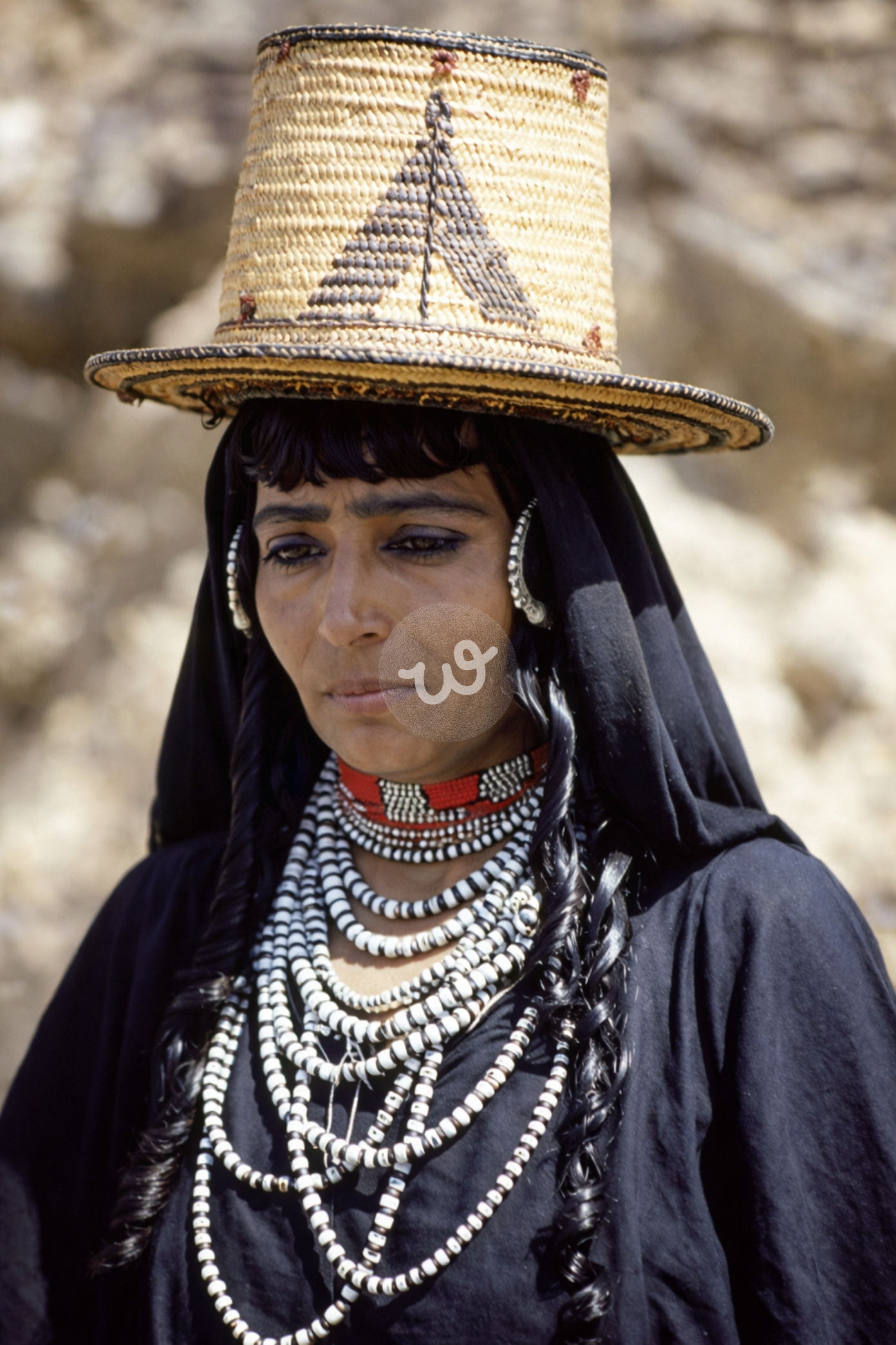 صورة التقطت في الثمانينات لامرأة من نساء جنوب غرب المملكة العربية السعودية ترتدي الزي التقليدي وتتزين بالحلي.