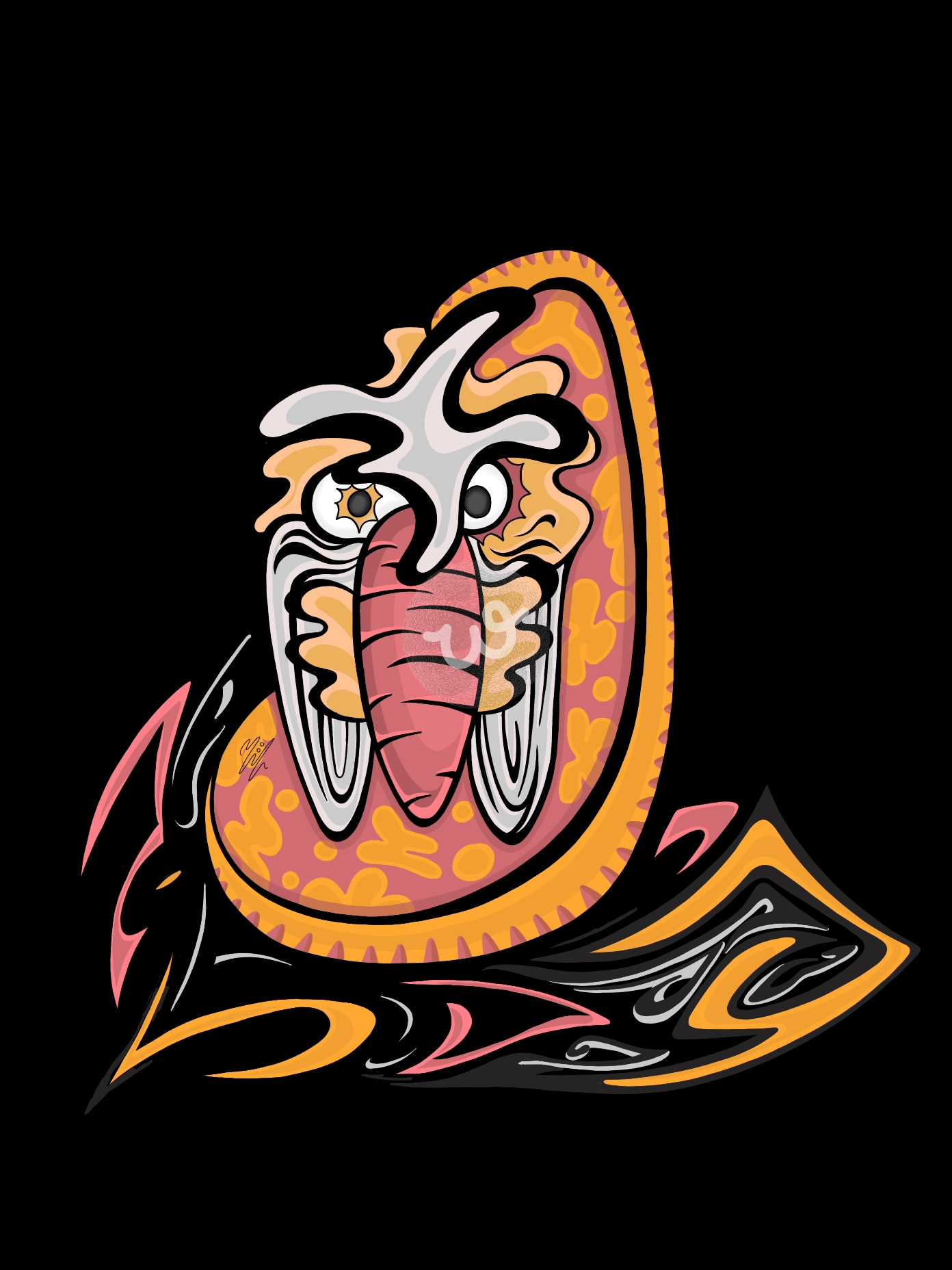 أرنب يُركز نظره إلى الأمام. لأُذنيه تفاصيل كالسجاد وتحيط به خطوط زُخرفية.
