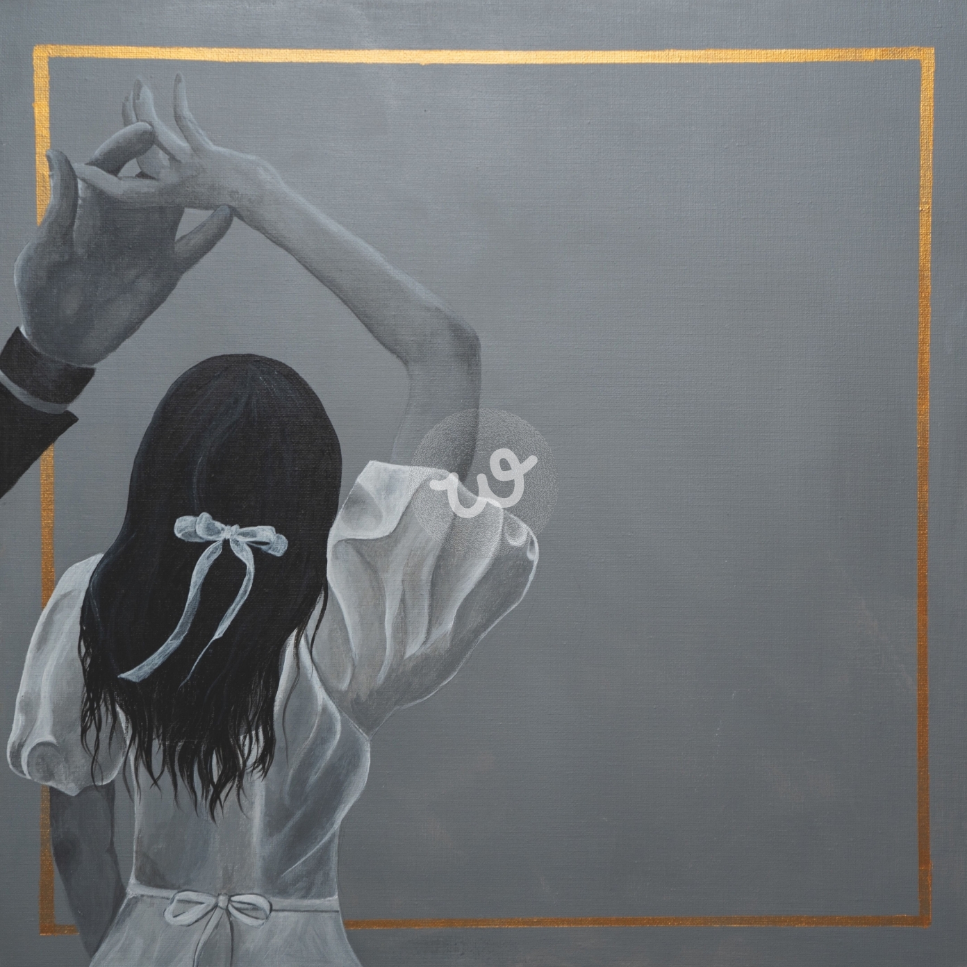 تجسد هذه اللوحة اللحظة التي تخطو فيها الفتاة أولى خطواتها في الرقصة مع والدها، شريكها الأول في الحياة. تمسك بيده بحب وثقة، وكأنه يوجهها ليس فقط في الرقصة، بل في كل دروب الحياة. الفستان الأبيض البسيط وشريط الشعر الناعم يرمزان إلى الطفولة والنقاء، بينما تضفي الخلفية الرمادية إحساسًا بالهدوء والتركيز على عمق العلاقة بين الأب وابنته. الإطار الذهبي الذي يحيط بجزء من المشهد يعكس قيمة هذه اللحظة الثمينة وكأنها ذكرى تُحفظ للأبد، كما يرمز إلى مكانة الأب التي لا تُقدَّر بثمن.