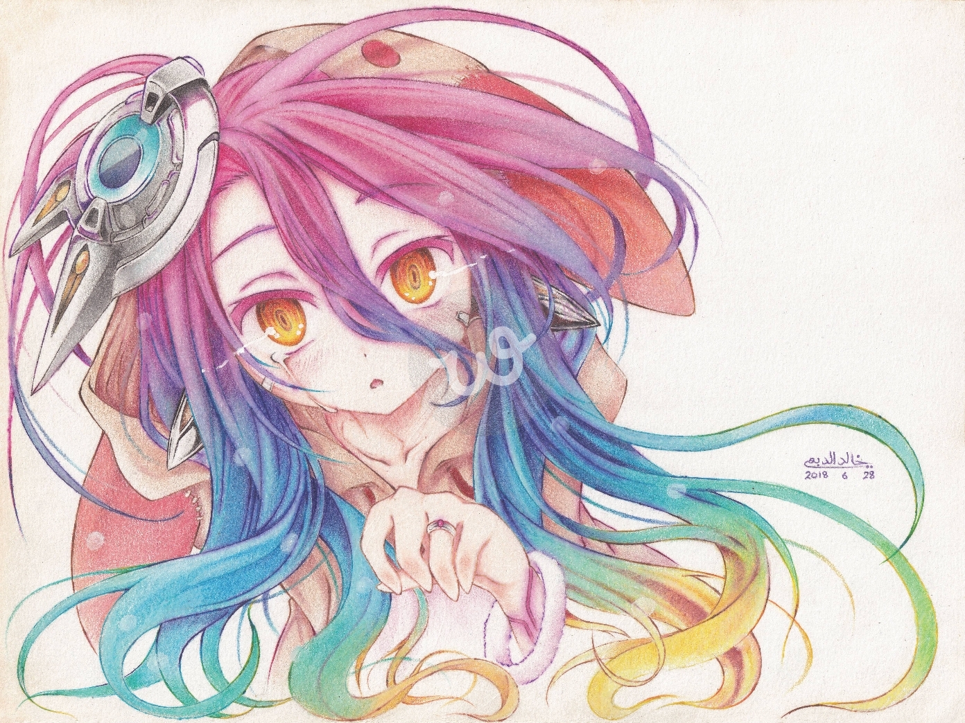 في هذه اللوحة، نرى شخصية أنمي ذات شعر طويل ينبض بالحياة بألوان قوس قزح، مما يضفي عليها طابعًا فريدًا وساحرًا. عيناها الواسعتان باللون الذهبي تعكسان مشاعر مختلطة من الحيرة والبراءة. التفاصيل الدقيقة في الإكسسوار الموضوع على رأسها، إلى جانب تدفق شعرها الملون بطريقة انسيابية، يضفي على الصورة لمسة خيالية جميلة. يبدو أن هذه الشخصية تنتمي إلى عالم مليء بالسحر والخيال، حيث تمتزج الألوان بتناغم رائع يعكس المشاعر الداخلية لهذه الشخصية الفريدة.