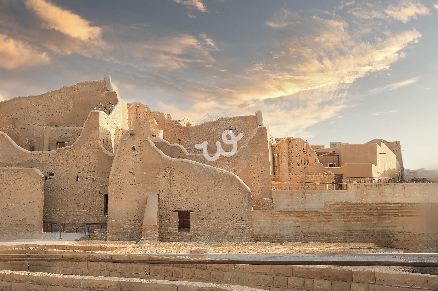 مشهد هادئ يلتقط دفء الغروب فوق مباني الدرعية التاريخية، حيث تتناغم ألوان الطين الذهبي مع السماء لتجسد جمال العمارة النجدية وأصالة المكان