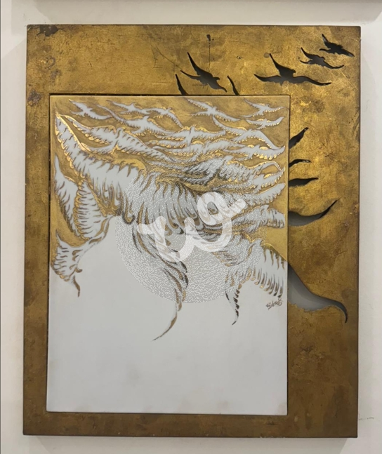 “الحرية” لوحة بورسلين فاخرة بتقنية الذهب، تصور طيورًا بيضاء أنيقة مزينة بلمسات ذهبية تطير عبر حدود ذهبية متشققة نحو الفضاء المفتوح. المساحة البيضاء الواسعة الفارغة في الأسفل ترمز إلى التحرر اللامحدود، معبرة عن طيران الروح المنتصر نحو النور والأمل والإمكانيات غير المقيدة.
