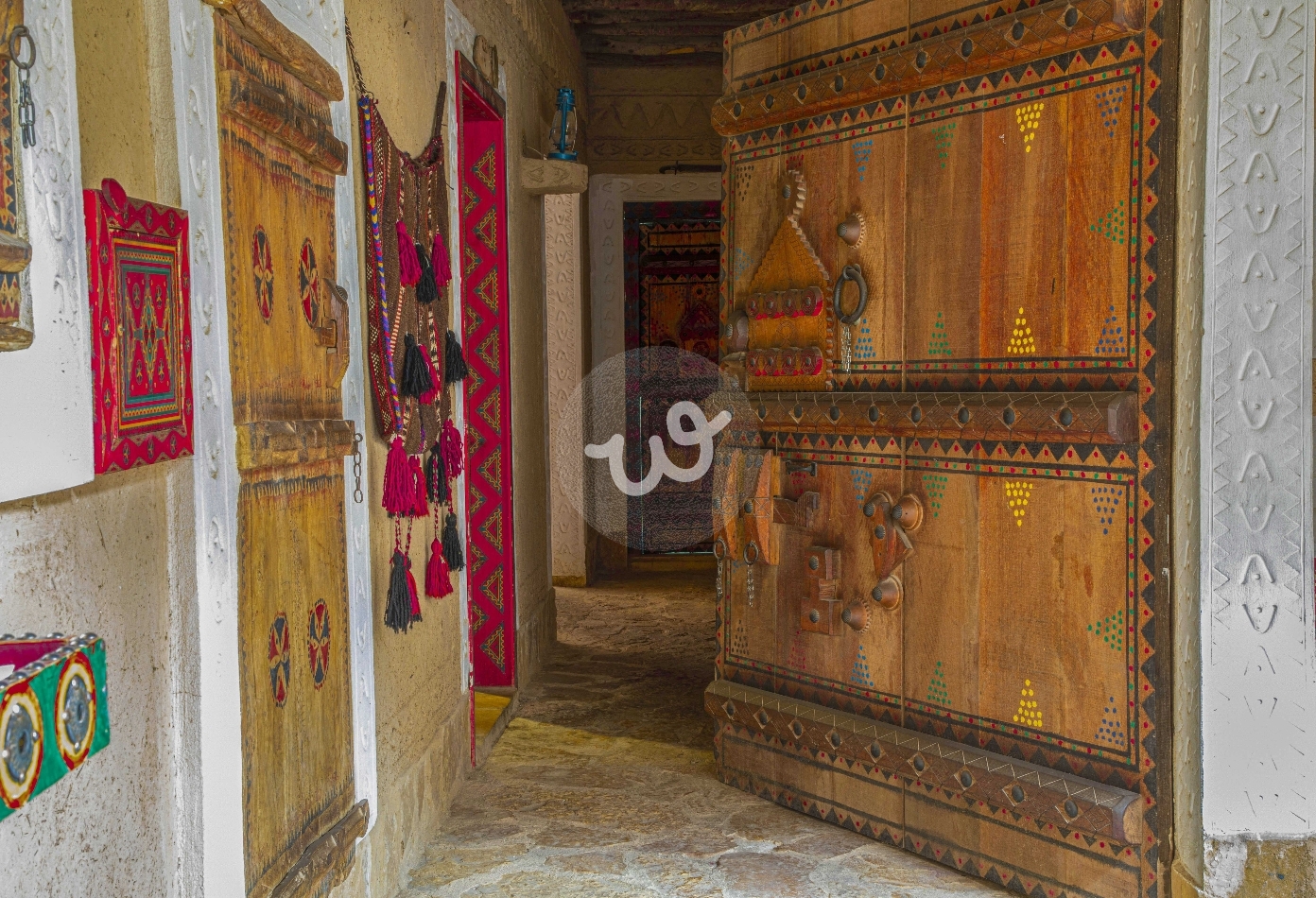 الصورة تُظهر مدخلًا تراثيًا مزخرفًا بأبواب خشبية منقوشة وألوان دافئة، تتدلى بجانبه أقمشة مزينة بنقوش هندسية. يعكس المشهد دفء البيوت النجدية القديمة، ويبرز جمال التفاصيل اليدوية في العمارة الشعبية السعودية.