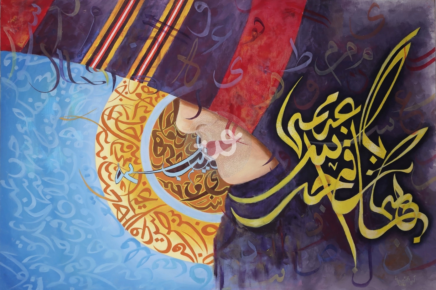تعكس اللوحة الفن والجمال والغموض، من حول الفتاة تبرز حروفيات بأشكال مختلفة، مما يضفي على اللوحة جوًا من الحركة والحيوية.