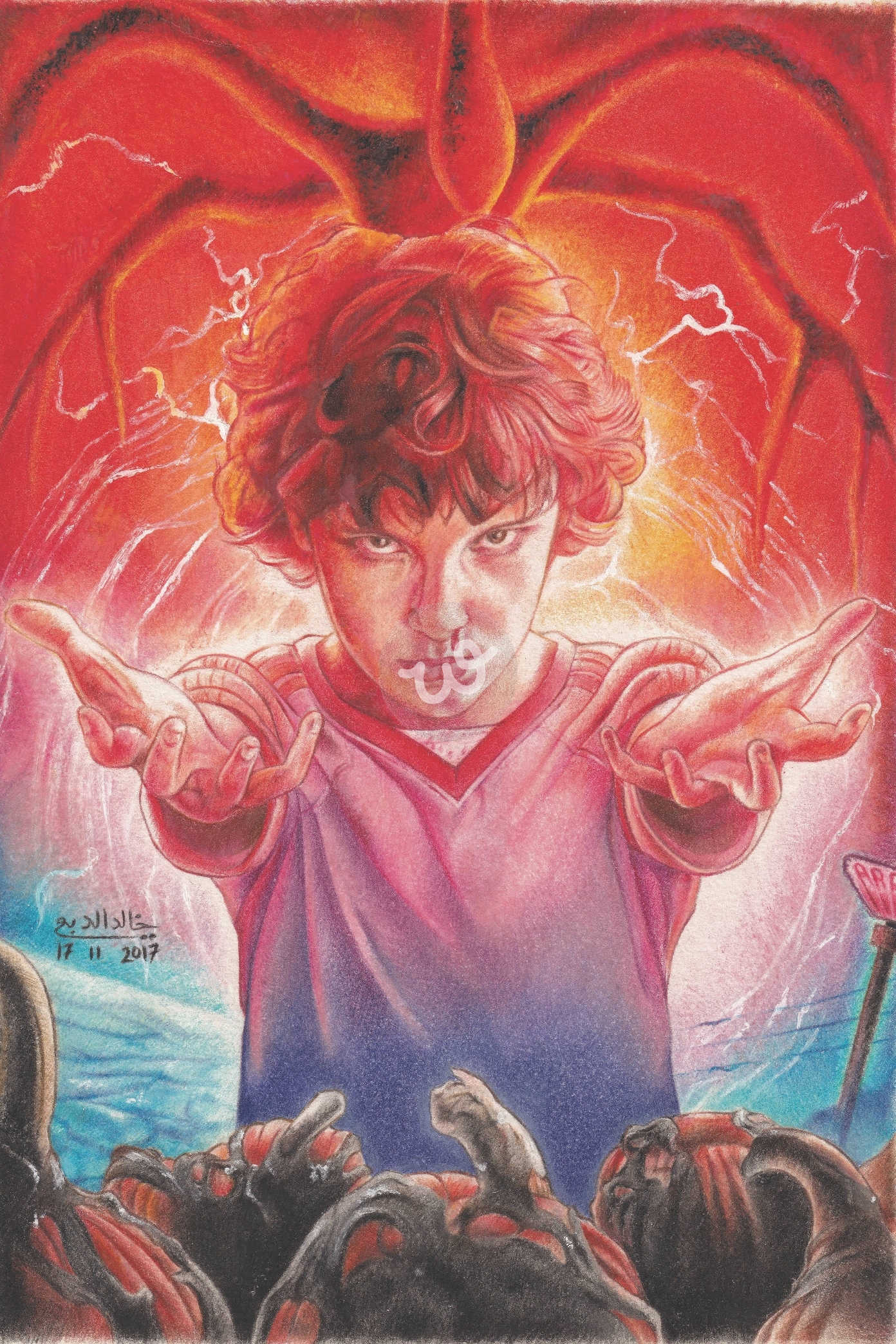 هذه اللوحة تصور لحظة مشحونة بالطاقة والغموض، حيث يقف فتى بنظرة حادة ويدين ممدودتين وكأنه يستدعي قوة خفية من عالم آخر. تحيط به هالة من الضوء الأحمر المتوهج، بينما يلوح في الخلفية مخلوق مرعب بأطراف ممتدة، وكأنه يفرض هيمنته على المشهد. الألوان القوية والتباين الحاد بين الضوء والظل يخلقان أجواءً درامية تشد الانتباه. في المقدمة، تظهر كائنات غريبة تتحرك باتجاه الفتى، وكأنها تترقب أو تخضع لسيطرته. هذه اللوحة تثير إحساسًا بالغموض، القوة، والصراع بين الخير والشر.