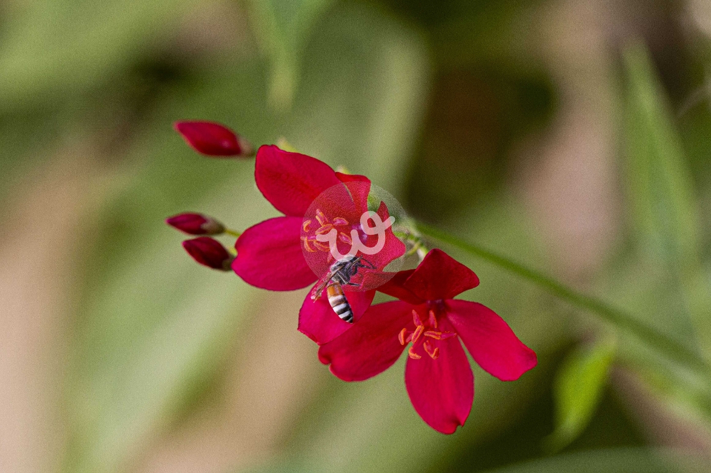 صورة ماكرو تُظهر نحلة تحط على زهرة حمراء متفتحة، في مشهد يجسد جمال الطبيعة وتوازنها الدقيق بين الحياة والعمل. التكوين يبرز التفاصيل الغنية للزهرة وسط خلفية ناعمة من اللون الأخضر.