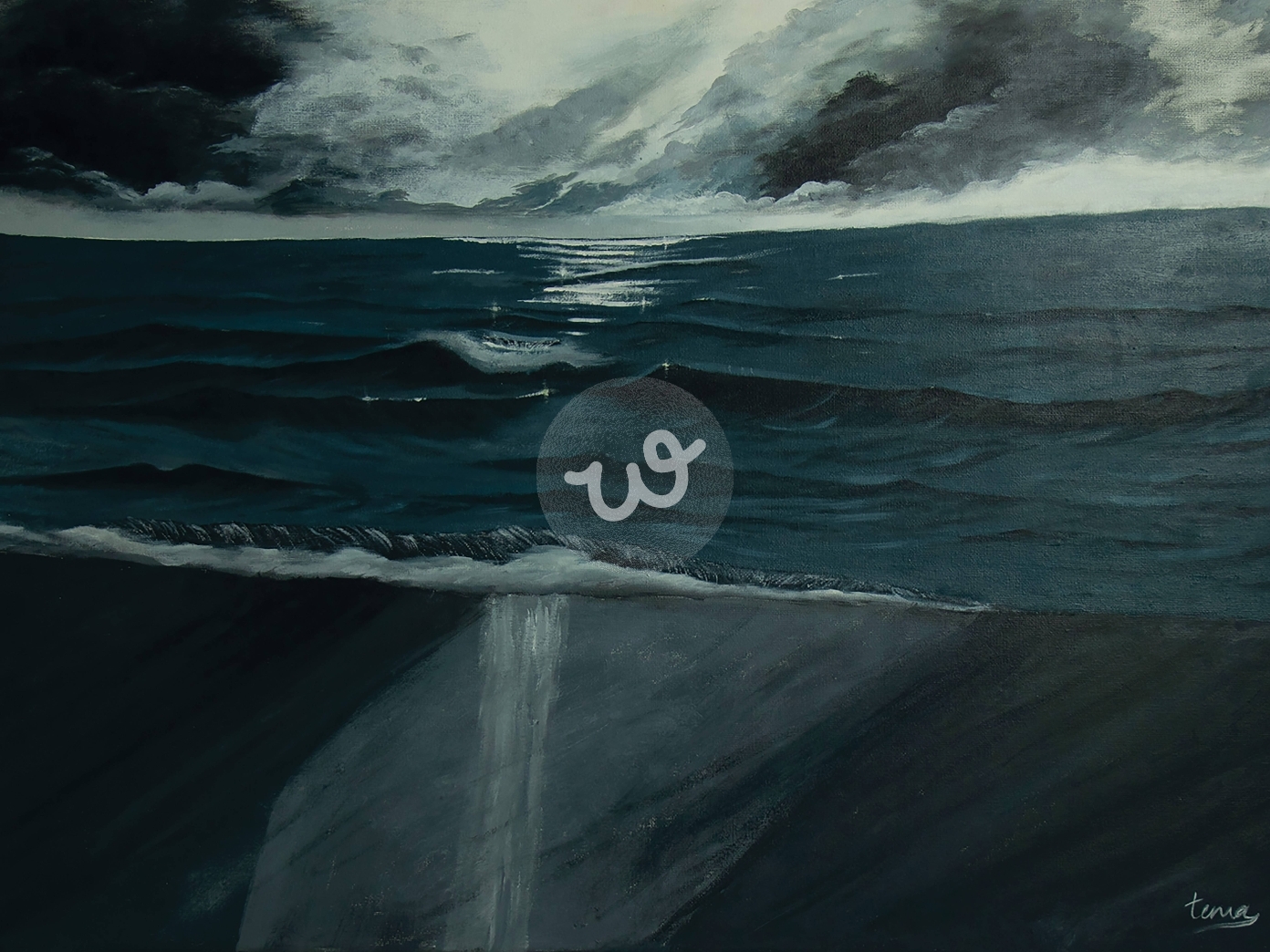 هذه اللوحة تحمل طابعاً درامياً قوياً، حيث تتجسد قوة البحر وعظمته في تدرجات اللون الأزرق الداكن والأسود. الأمواج تتماوج بشكل هادئ لكنه يحمل في طياته إحساساً بالغموض، بينما تمتد الظلال الداكنة من الشاطئ لتندمج مع سطح البحر، وكأنها تفصل بين عالمين. في الأفق، تتراكم السحب الثقيلة، مما يضفي على المشهد توتراً بصرياً يوحي باقتراب العاصفة أو لحظة تحول الطبيعة. الضوء المنعكس على سطح الماء يكسر حدة الظلام، مما يخلق توازناً بصرياً بين الظل والنور.