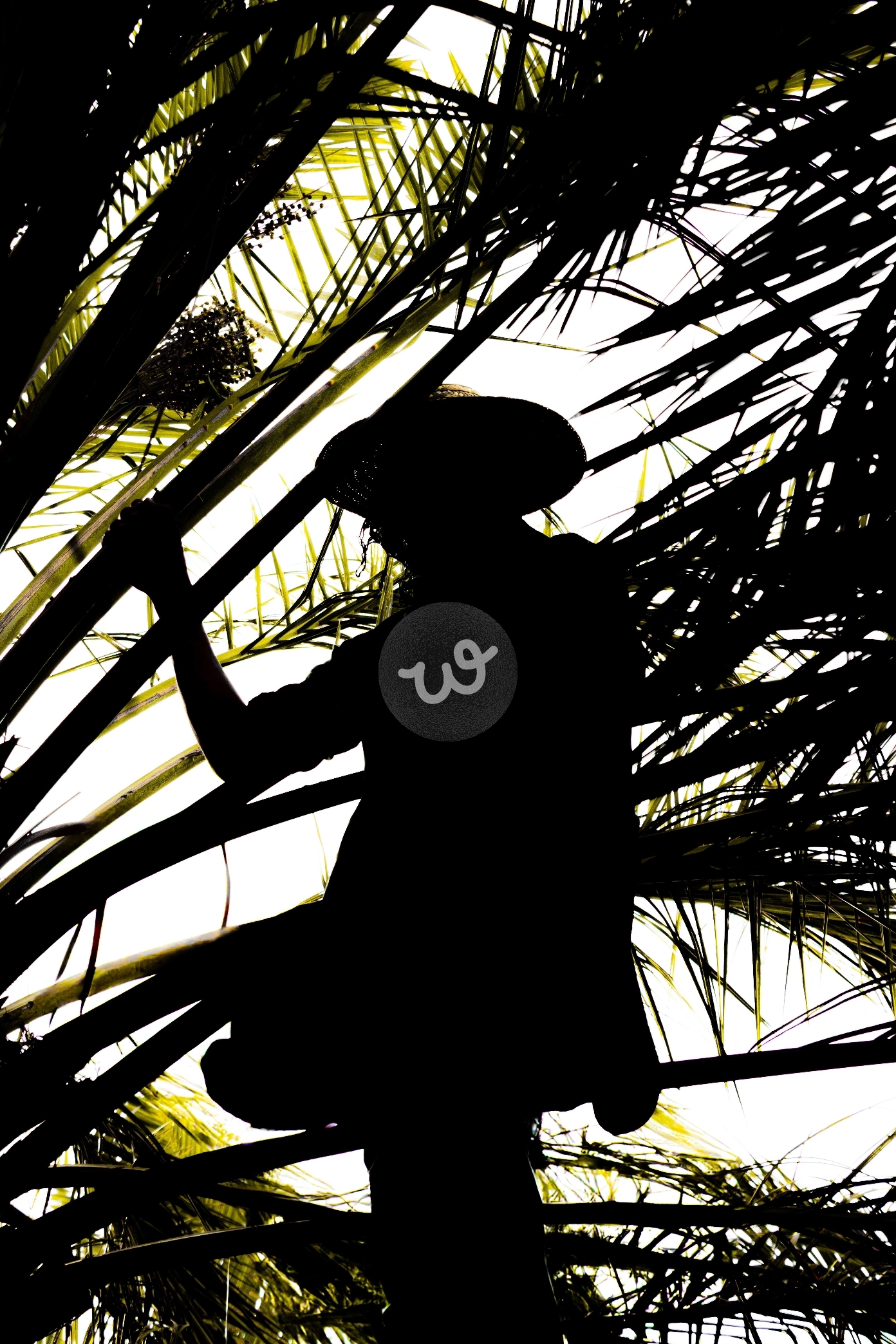 عمل فوتوغرافي يلتقط silhouette لعامل يتسلق النخلة، محاطًا بأغصانها الكثيفة التي تتخللها أشعة الضوء. يظهر الجسد كظلٍ أسود متداخل مع الخطوط الهندسية لأوراق النخيل، في تداخل بصري يجسد العلاقة العميقة بين الإنسان والأرض. يعكس العمل قيمة العمل اليدوي في جمع الرطب ويستحضر ذاكرة الموروث الزراعي الذي شكّل جزءًا من الهوية الثقافية، حيث تمتزج قوة الجسد مع رمزية النخلة كعنصر حياة وعطاء