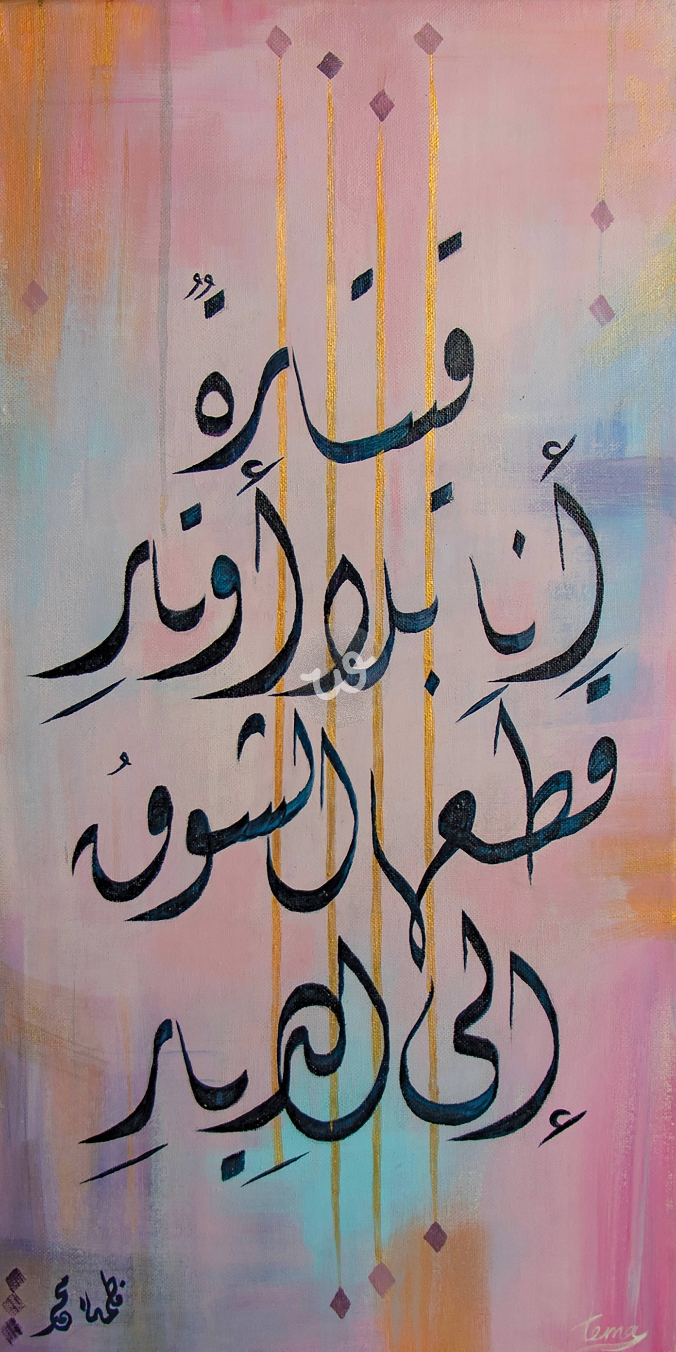 هذه اللوحة تجمع بين فن الخط العربي والتجريد اللوني بتناغم بصري مميز. يتوسطها بيت الشعر لقصيدة "قيثارة بلا أوتار" للشاعر اليمني سالم محمد عبدالعزيز: "قيثارة أنا بلا أوتار قطعها الشوق إلى الديار" وقد تم تنفيذ اللوحة بالخط الديواني. الخلفية تتدرج بين ألوان هادئة من الوردي، الأزرق، والبنفسجي، مما يضفي أجواءً حالمة تتناسب مع عمق المعنى.
