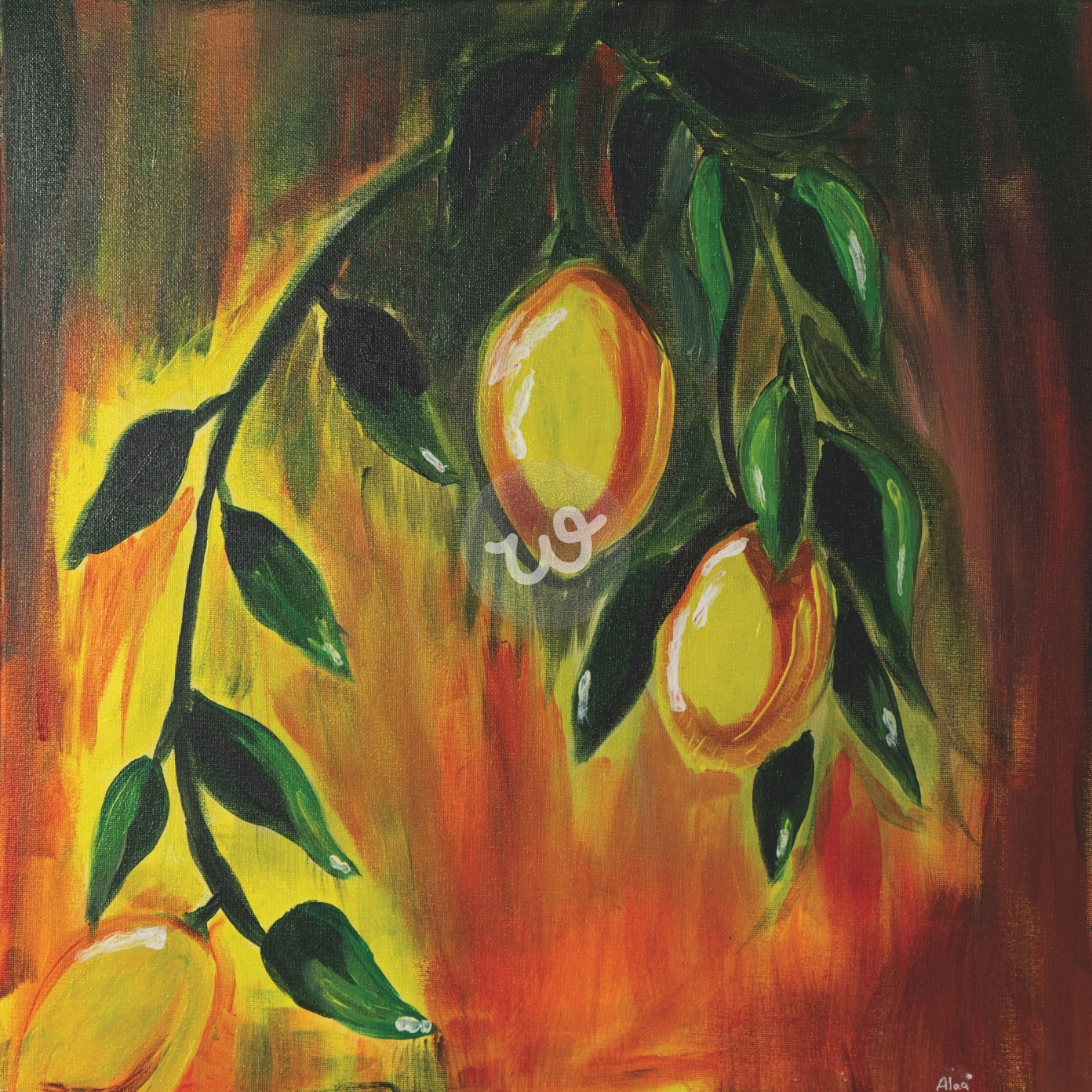 لوحة تعكس جمال الطبيعة وبساطتها، حيث تظهر ثمار الليمون النضرة تتدلى بألوان دافئة تعكس الأمل والنمو. الألوان تنساب بتناغم، تعبيرًا عن النضوج والانتعاش، لتجسد جوًا من الهدوء والطبيعة الخلابة