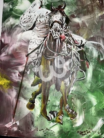 عمل إنطباعي غلب علية درجات الألوان البارده الاخضر والبني موضوع العمل يتبع مجموعة خيل . يمثل علاقة الفارس بالحصان.