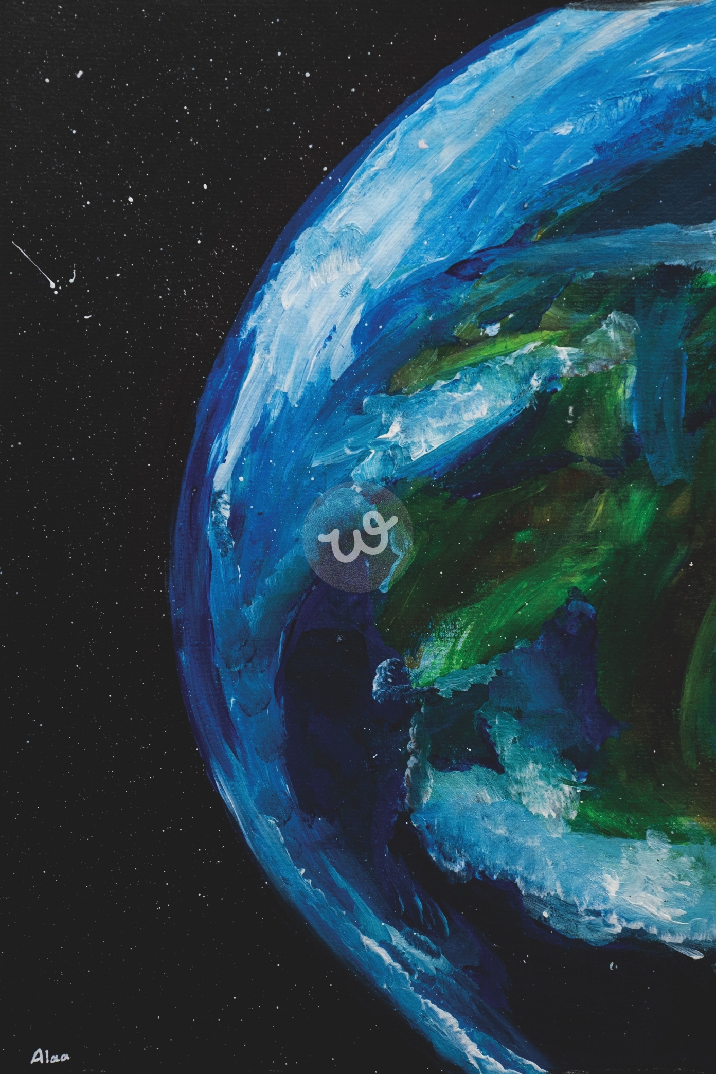 اللوحة تسلط الضوء على كوكب الأرض بألوانها المتناغمة بين الأزرق والأخضر، مع سماء مليئة بالعمق والسرية. تبرز الأرض بجمالها وتفاصيلها الدقيقة، مع تدرجات الألوان التي تعكس الحياة المتجددة. تنقل اللوحة إحساسًا بالتواصل مع الطبيعة وسحرها المدهش، وتعكس عظمة الكوكب في أبسط تجلياته