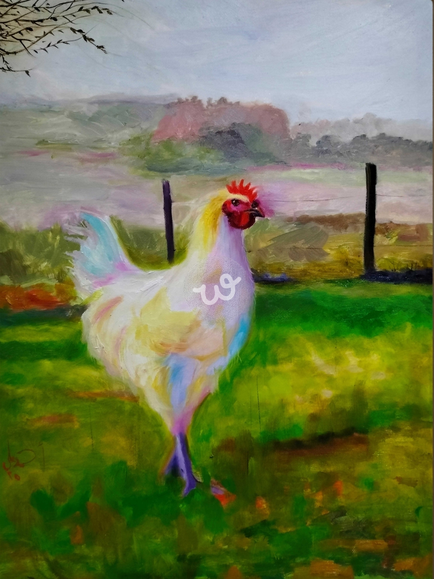 لوحه فنيه لدجاجه ف مزرعه الوان زيتية ع توال قماش بإسلوب تعبيرى فني